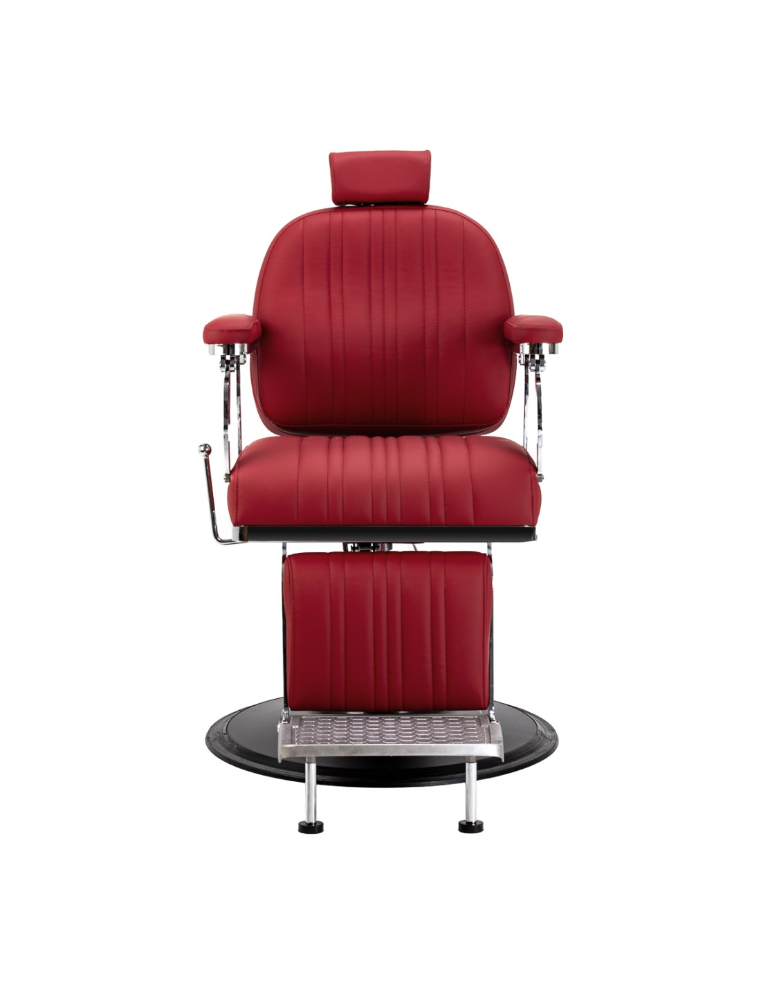 La base stabile garantisce un sostegno sicuro e un elevato comfort di utilizzo. Il sedile imbottito con schiuma resistente alle deformazioni e il rivestimento in pelle sintetica opaca garantiscono durata e comfort a lungo termine. I materiali si distinguono per la loro resistenza all'umidità e la facilità di pulizia. Il rivestimento bordeaux abbinato a elementi metallici cromati e a un poggiapiedi decorativo conferisce alla poltrona un carattere distintivo e classico. Le cuciture verticali sottolineano lo stile vintage, che si inserisce perfettamente nell'atmosfera dei saloni di barbiere professionali. I dettagli accuratamente rifiniti conferiscono all'insieme un aspetto rappresentativo, mentre la struttura funzionale favorisce un lavoro confortevole ed efficiente.