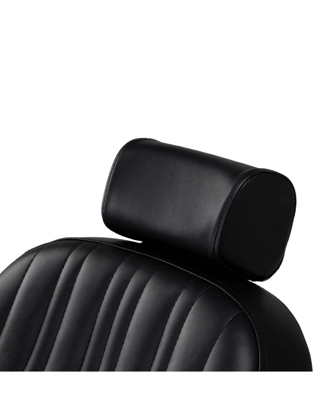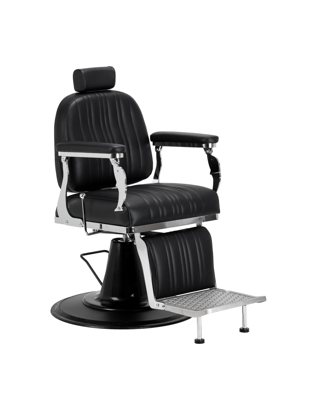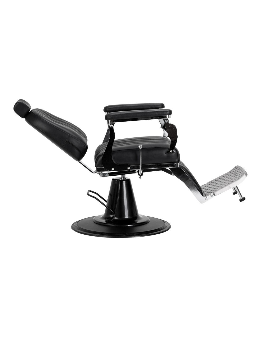 La base stabile garantisce un sostegno sicuro e un elevato comfort di utilizzo. Il sedile imbottito con schiuma resistente alle deformazioni e il rivestimento in pelle sintetica semilucida garantiscono durata e comfort a lungo termine. I materiali si distinguono per la loro resistenza all'umidità e la facilità di pulizia. Il rivestimento nero abbinato agli elementi metallici cromati e al poggiapiedi decorativo conferisce alla poltrona un carattere distintivo e classico. Le cuciture verticali sottolineano lo stile vintage, che si inserisce perfettamente nell'atmosfera dei saloni di barbiere professionali. I dettagli accuratamente rifiniti conferiscono all'insieme un aspetto rappresentativo, mentre la struttura funzionale favorisce un lavoro comodo ed efficiente.