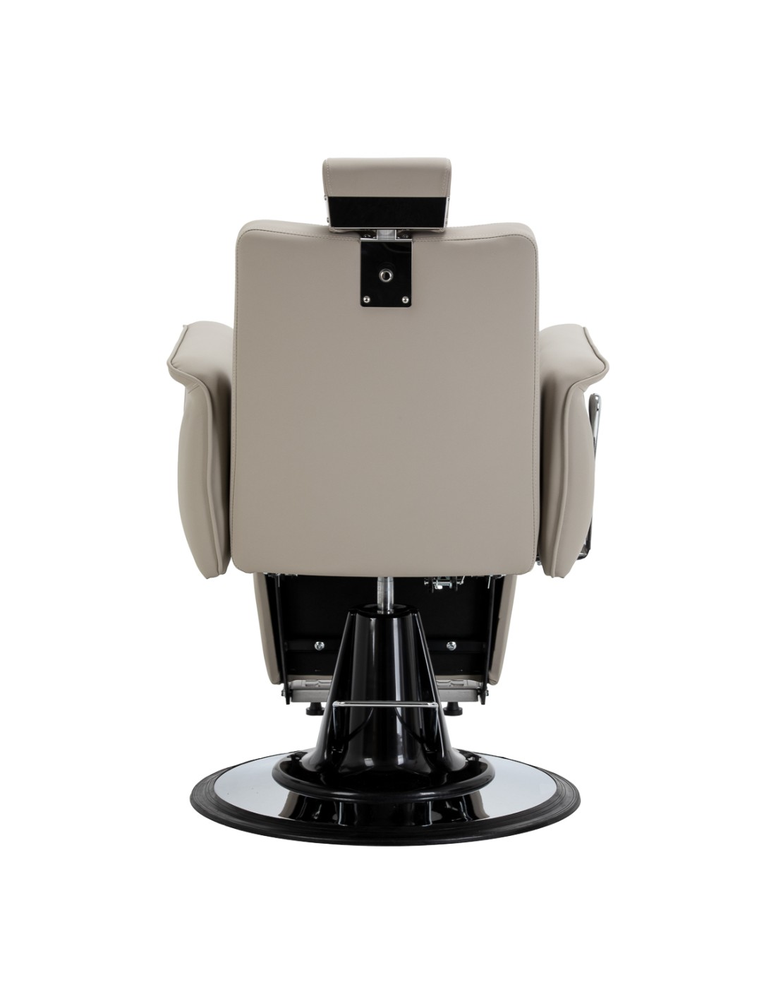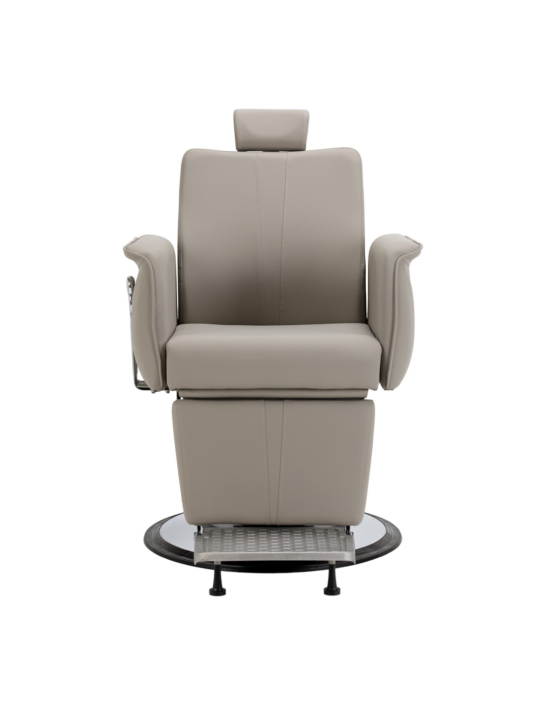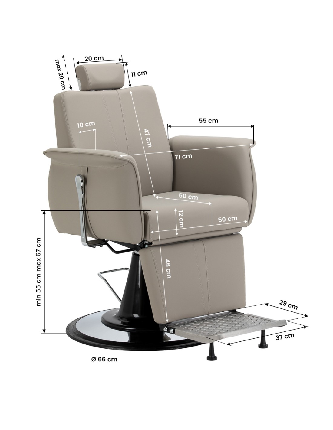 La base stabile e rotonda con finitura in metallo garantisce un sostegno sicuro e un utilizzo sicuro. Il sedile, lo schienale e il poggiapiedi sono imbottiti con schiuma resistente alle deformazioni e rivestiti in pelle sintetica grigia piacevole al tatto, che garantisce durata e un elevato comfort di utilizzo. I materiali utilizzati sono resistenti all'umidità e facili da pulire, il che rende la poltrona perfetta per l'uso quotidiano. I colori tenui e la forma classica consentono un abbinamento armonioso con l'arredamento dei saloni da barbiere moderni e tradizionali.