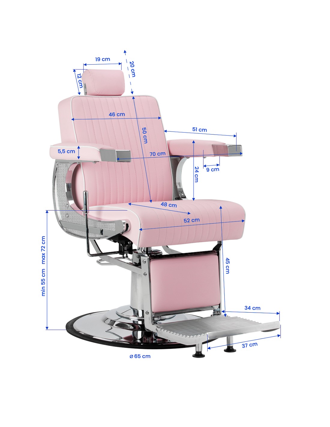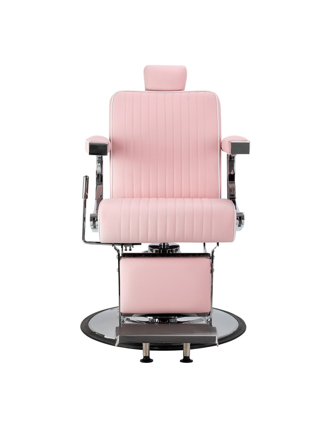 La robusta struttura della base garantisce stabilità ed elevato comfort. Il sedile è imbottito di schiuma resistente alla deformazione e rivestito di morbida pelle sintetica opaca, che unisce durata e comfort. I materiali utilizzati per la finitura sono resistenti all'umidità, durevoli e facili da pulire, rendendo la sedia perfetta per l'uso quotidiano. Le cuciture eleganti e il rivestimento nei toni del rosa le conferiscono un carattere unico, integrandosi perfettamente con l'arredamento dei moderni barbieri.