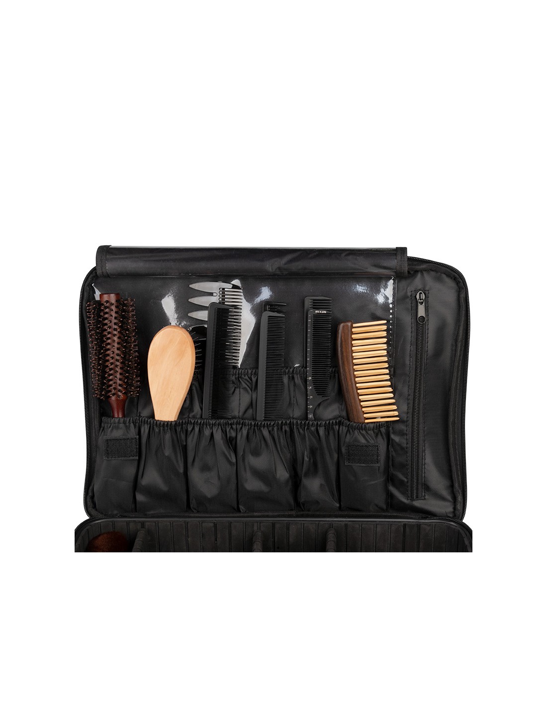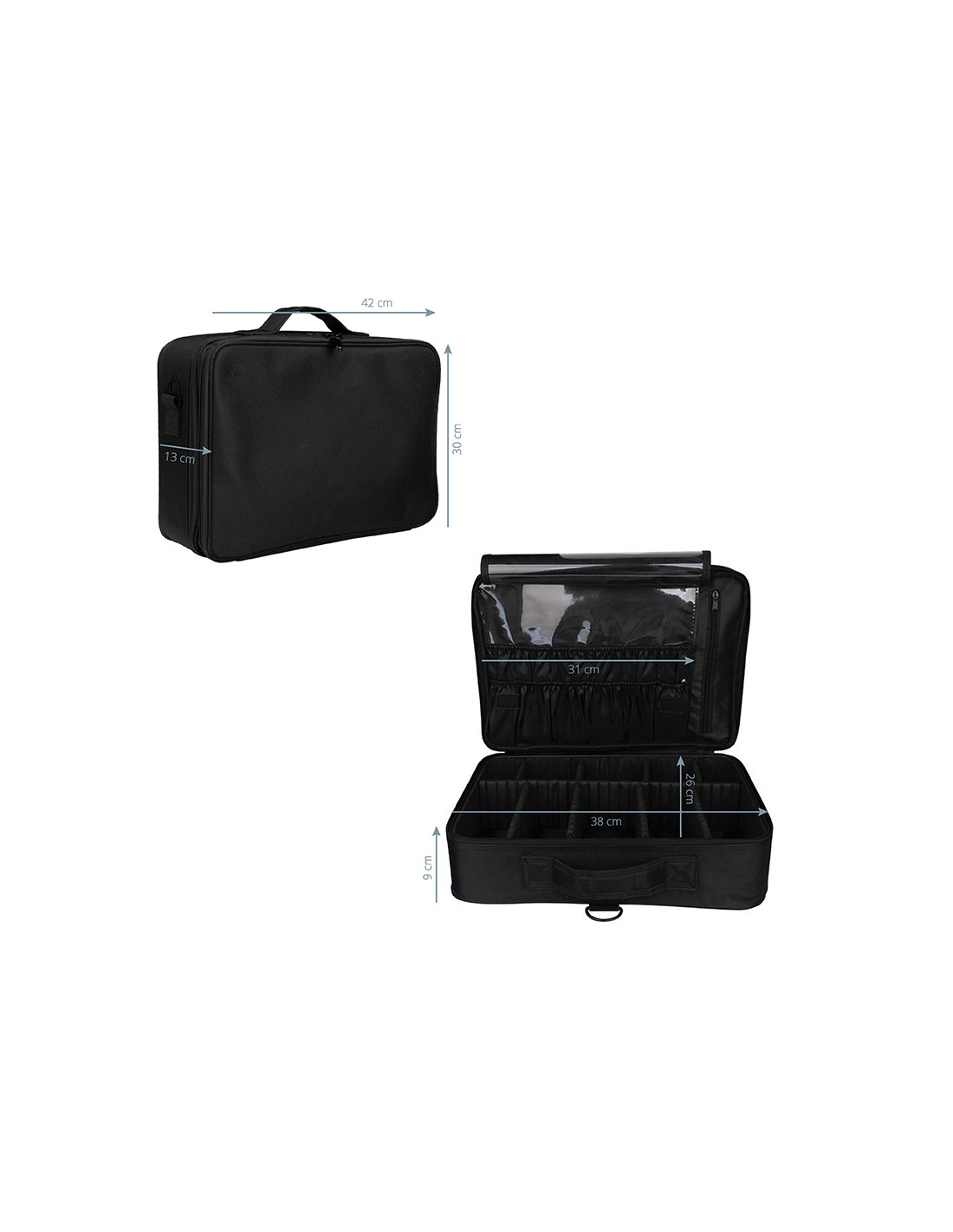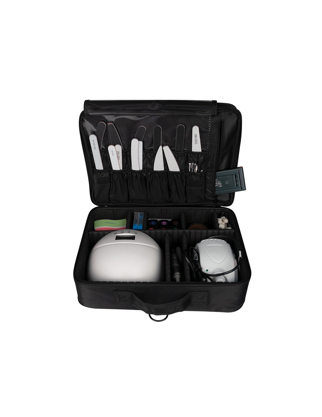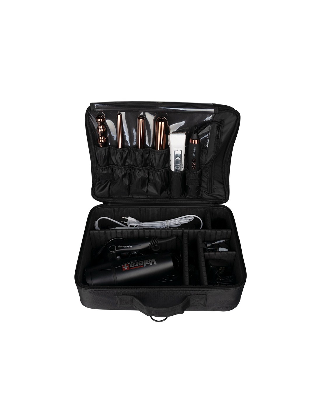 Elegante custodia realizzata in materiale resistente. Dotata di una maniglia per facilitare il trasporto e di una tracolla. L'interno è dotato di divisori regolabili che consentono di adattare l'interno alle proprie esigenze. Ideale per trasportare la fresatrice, il phon e gli accessori.
