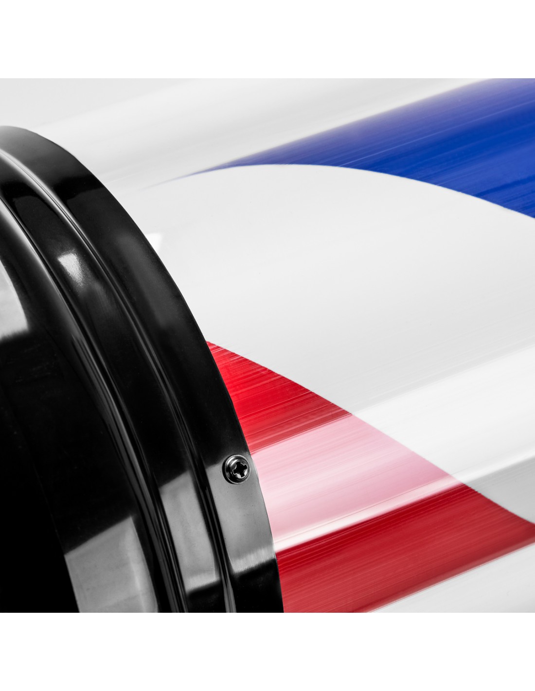 L'accattivante plafond illuminato, dotato di un cilindro rotante, è la pubblicità perfetta per il barbiere. Il design distintivo, con elementi rotanti nei colori rosso, bianco e blu, crea uno spettacolo unico e riconosciuto a livello internazionale per il barbiere. Il telecomando sul cavo consente di attivare sia l'illuminazione che la rotazione del plafond.