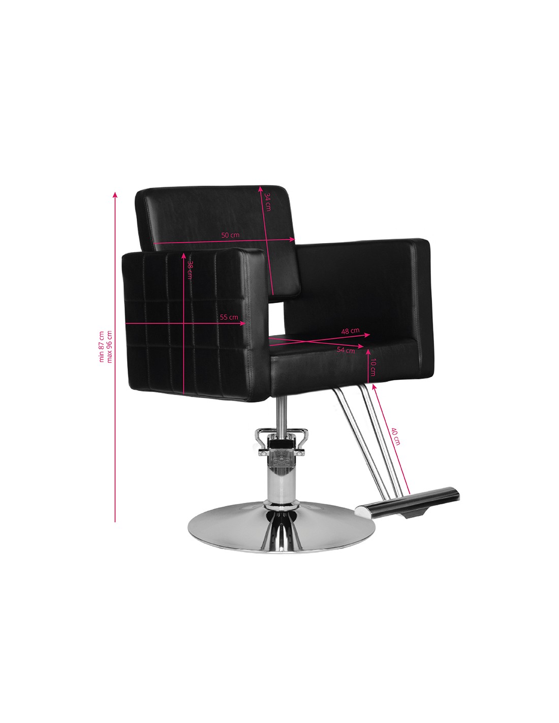 Moderna poltrona per parrucchieri di HAIR SYSTEM. Elegante e molto confortevole. Una solida base cromata garantisce la stabilità della seduta. Il rivestimento è in ecopelle nera di alta qualità. La poltrona è inoltre dotata di regolazione verso l'alto e verso il basso. Dimensioni: 65x63x62