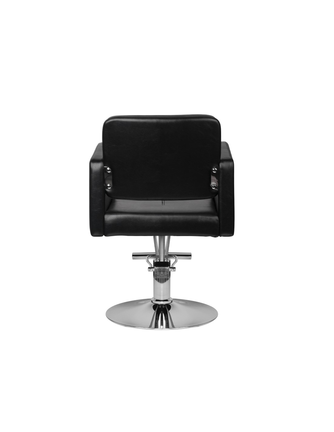 Moderna poltrona per parrucchieri di HAIR SYSTEM. Elegante e molto confortevole. Una solida base cromata garantisce la stabilità della seduta. Il rivestimento è in ecopelle nera di alta qualità. La poltrona è regolabile verso l'alto e verso il basso.
