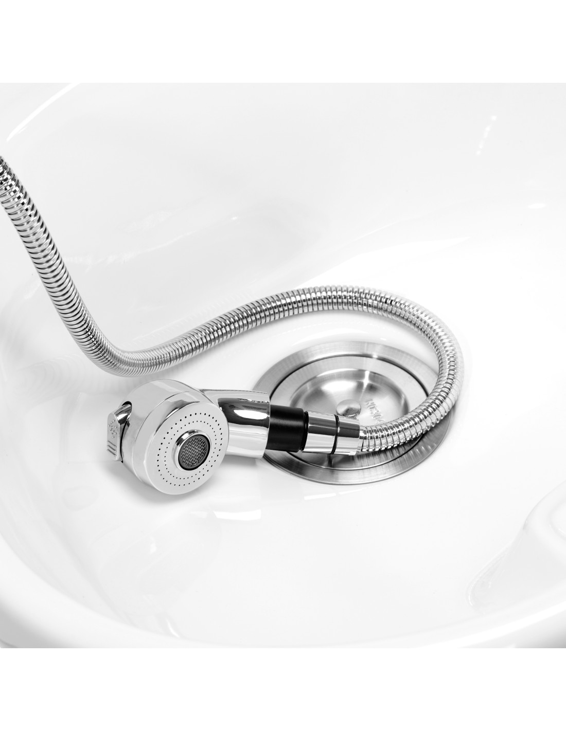 La lavatrice è dotata di un miscelatore che garantisce un accesso costante all'acqua calda e fredda. Ciò consente di regolare facilmente la temperatura in base alle proprie preferenze. Una manopola doccia con tubo flessibile lungo 120 cm e un posto dedicato per riporla facilitano il lavoro, mentre un tappo cromato con uno speciale filtro consente di controllare il flusso dell'acqua e di mantenere elevati standard igienici nel salone. L 'attacco dell'acqua è stato posizionato all'interno della colonna, consentendo di nascondere efficacemente le tubature, mentre il pannello facile da rimuovere permette di accedere senza problemi quando necessario. La poltrona è stata sagomata in modo da garantire il comfort per una varietà di trattamenti e il poggiapiedi offre un eccellente sostegno alle gambe. La combinazione di funzionalità e convenienza renderà il lavoro in un salone di parrucchieri ancora più confortevole.