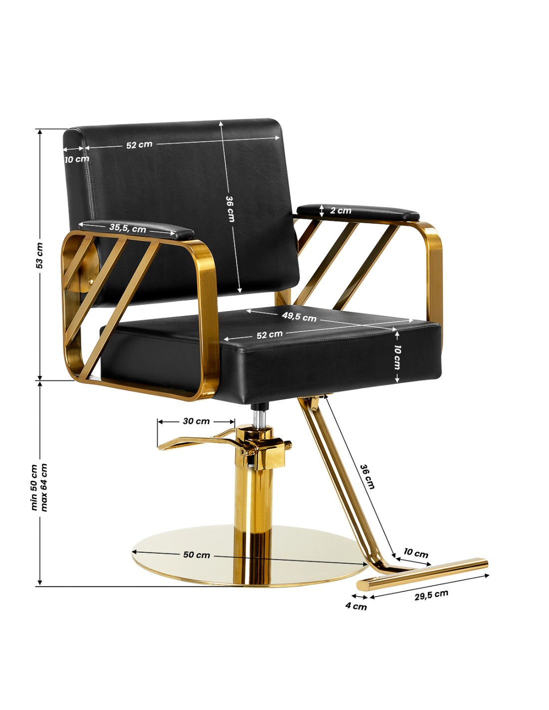 Questo comodo mobile è imbottito di schiuma durevole e resistente alla deformazione, mentre il rivestimento è realizzato in pelle sintetica piacevole al tatto nei toni del nero. I materiali utilizzati garantiscono un uso confortevole del mobile per lungo tempo e lo rendono resistente all'umidità, durevole e facile da pulire. Gli elementi decorativi geometrici in metallo nei toni dell'oro sui lati della sedia conferiscono al mobile un'espressione di eleganza senza tempo. La poltrona per parrucchieri Gabbiano B217 si distingue per il suo design, che le conferisce un carattere unico e la rende perfetta per molti saloni eleganti.