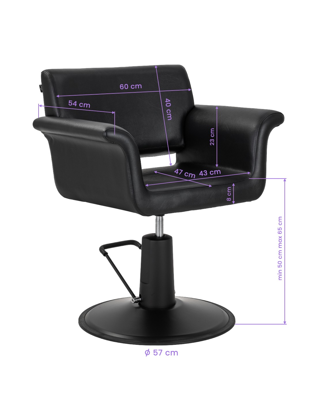 Il robusto sollevatore idraulico consente di regolare agevolmente l'altezza della seduta da 50 a 65 cm, anche quando il cliente è seduto. In questo modo è facile regolare la posizione in base all'altezza del cliente e dello stilista, favorendo una postura ergonomica durante il lavoro. Il comodo schienale offre un supporto stabile alla schiena, garantendo il comfort anche durante i trattamenti più lunghi. Il meccanismo di rotazione completa aumenta la libertà di movimento e consente un facile accesso alla cliente da tutti i lati.