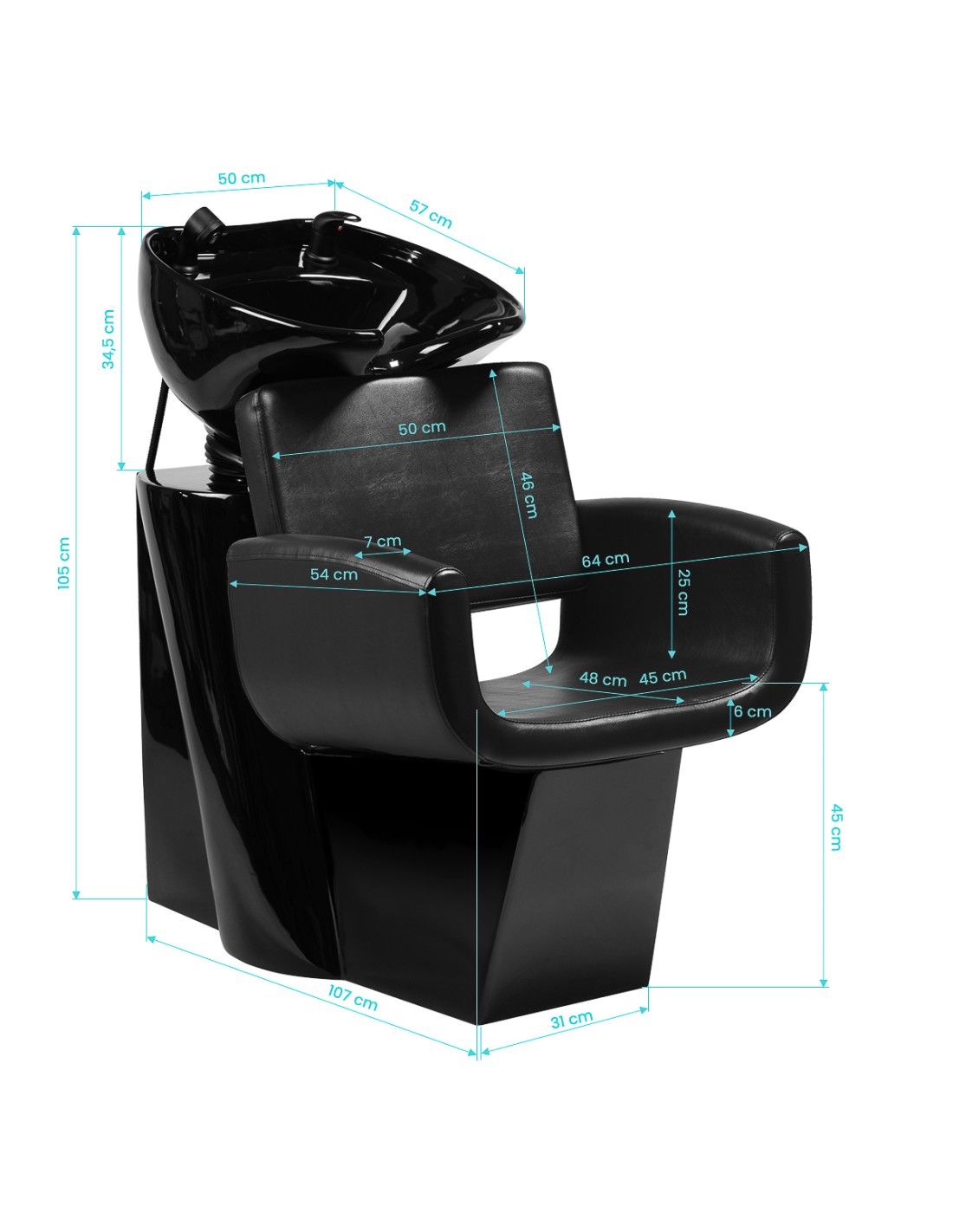 La profonda vasca in ceramica nei toni del nero riduce gli schizzi di acqua e cosmetici utilizzati durante i trattamenti. L'angolo di inclinazione regolabile consente di adattarsi alle esigenze individuali. Il materiale durevole è resistente a macchie, graffi e sostanze chimiche e la superficie liscia ne facilita la pulizia. Il collare ergonomico offre un comodo supporto per la testa.