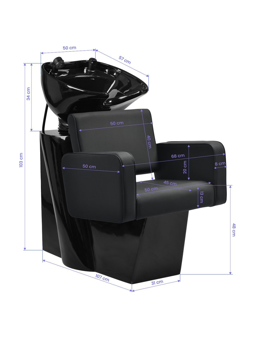 La forma geometrica della poltrona, con bordi dolcemente arrotondati , unisce semplicità e comfort in un design moderno. Il sedile quadrato e i braccioli dolcemente angolati creano un insieme armonioso, garantendo una posizione confortevole durante i trattamenti. Lo schienale, con il suo angolo di inclinazione ottimale, favorisce una postura corretta, consentendo un completo relax. Il rivestimento in pelle sintetica nera di alta qualità è resistente e facile da pulire. La forma geometrica e moderna dei mobili sottolinea il carattere elegante del lavatesta e si integra perfettamente con l'arredamento del salone. Il set comprende una serie completa di accessori con finitura nera opaca, tra cui rubinetto, soffione e tubi flessibili coordinati, per garantire un set completo di strumenti per il lavoro.
