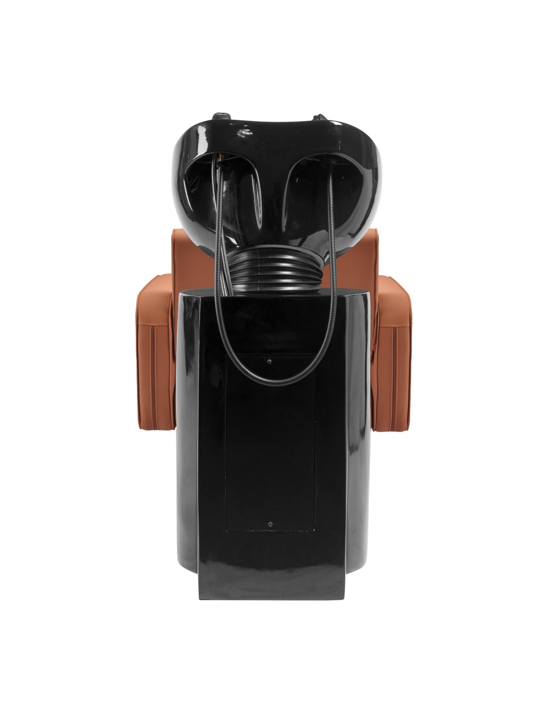 La forma geometrica della poltrona, con bordi dolcemente arrotondati , unisce semplicità e comfort in un design moderno. Il sedile quadrato e i braccioli dolcemente angolati creano un insieme armonioso, garantendo una posizione confortevole durante i trattamenti. Lo schienale, con il suo angolo di inclinazione ottimale, favorisce una postura corretta, consentendo un completo relax. Il rivestimento in pelle sintetica marrone di alta qualità è resistente e facile da pulire. La forma geometrica e moderna dei mobili sottolinea il carattere elegante del lavatesta e si integra perfettamente con l'arredamento del salone. Il set comprende una serie completa di accessori con finitura nera opaca, tra cui rubinetto, soffione e tubi flessibili coordinati, per garantire un set completo di strumenti per il lavoro.