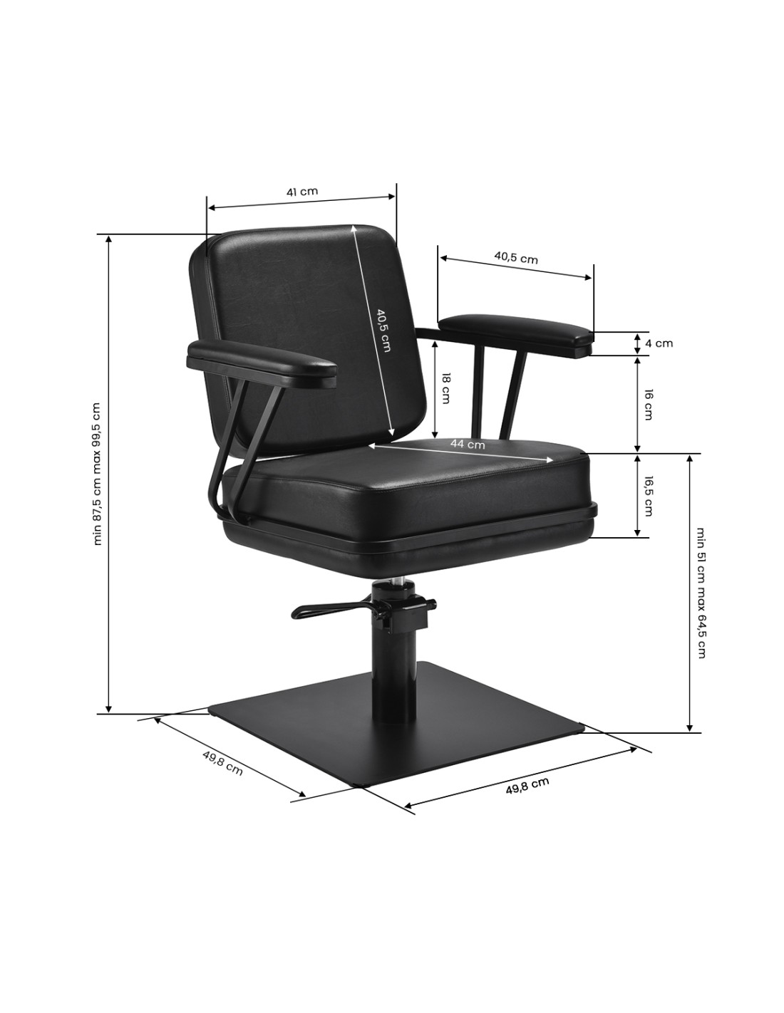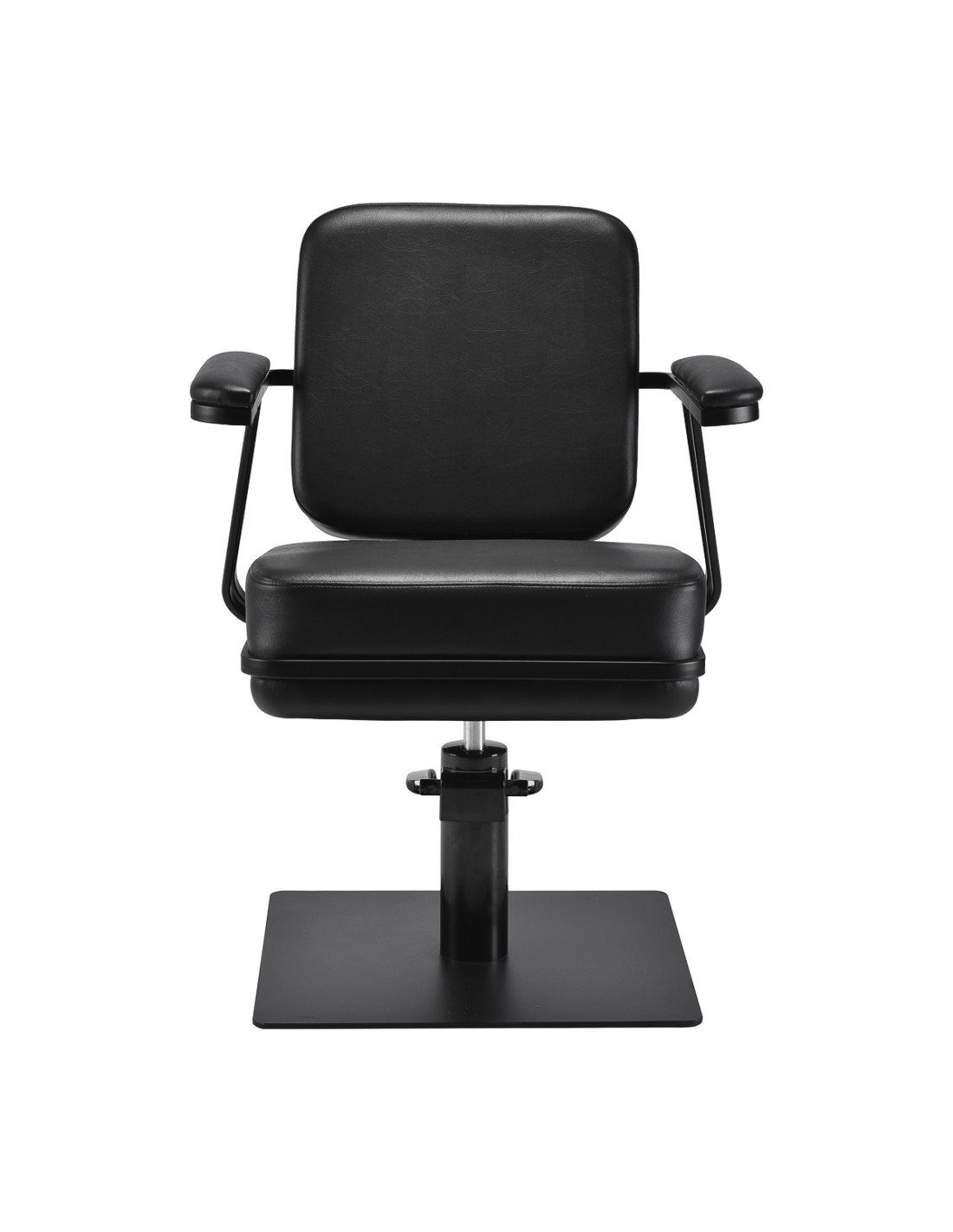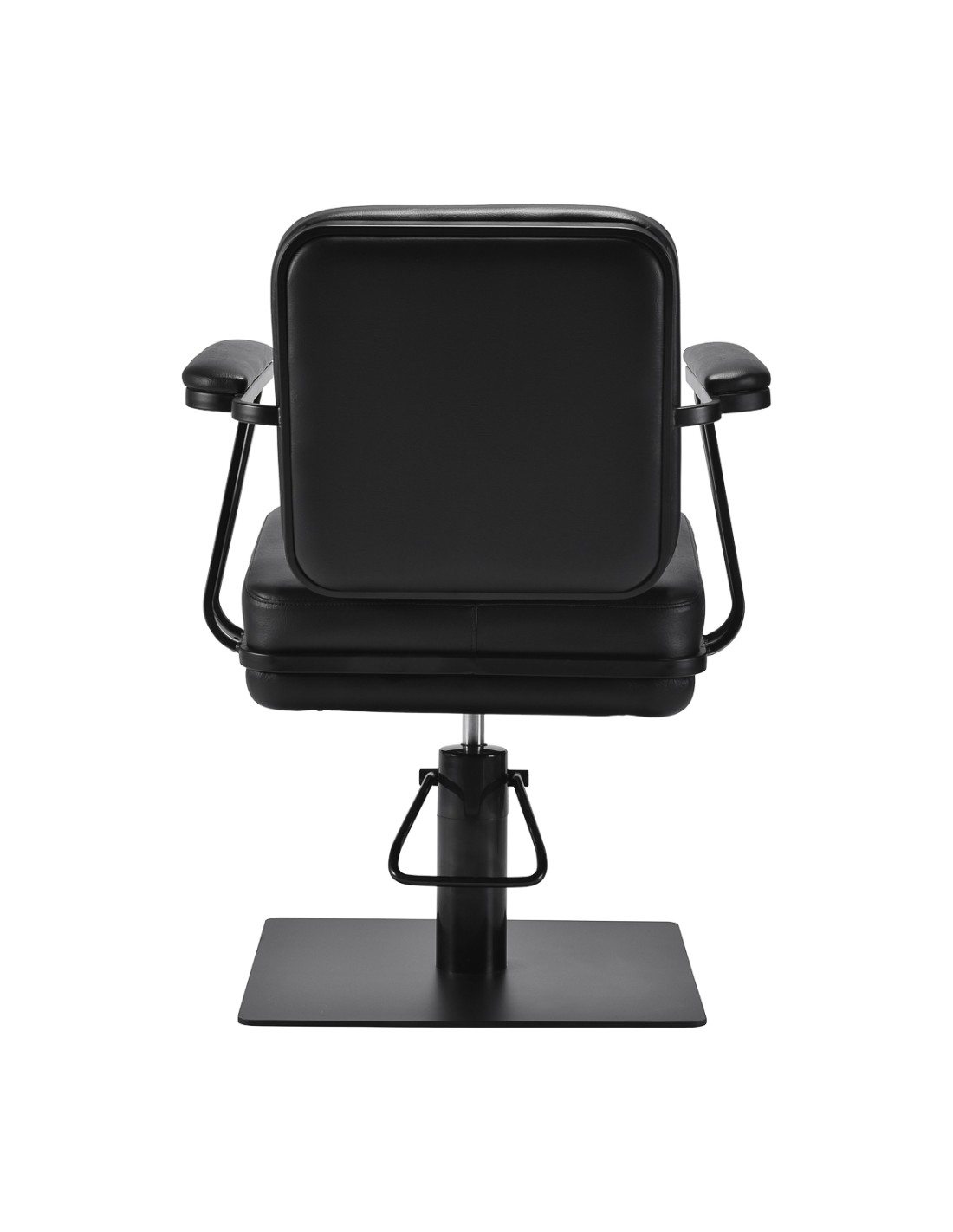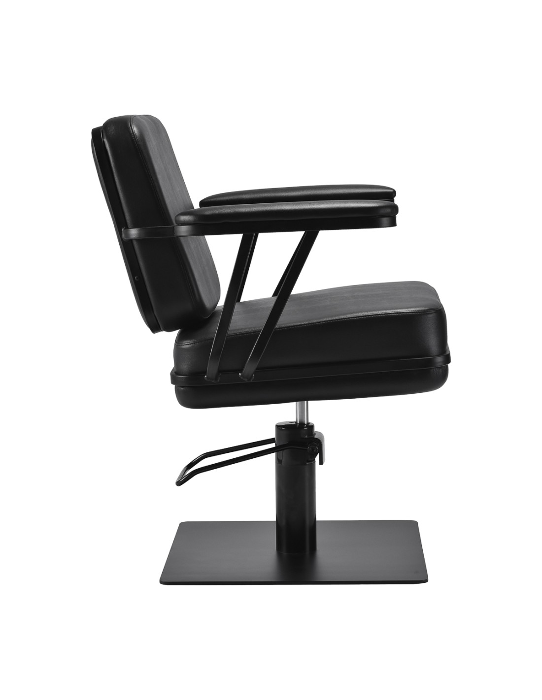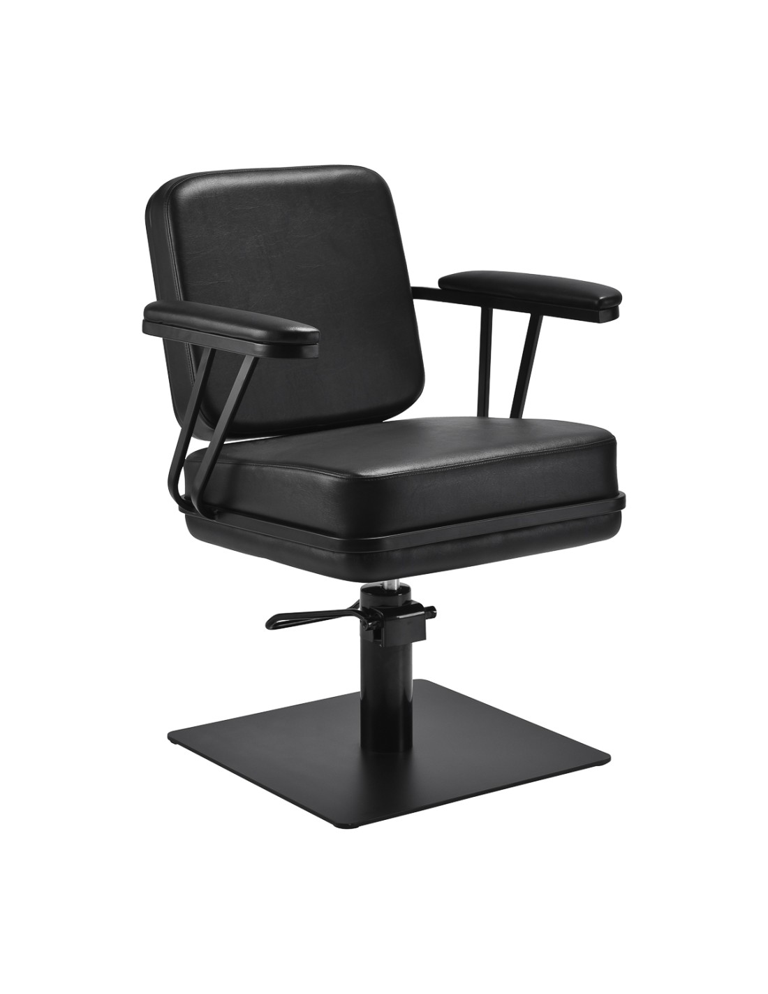 La poltrona sagomata offre sostegno lombare e un elevato comfort di utilizzo, mentre i braccioli imbottiti consentono il corretto posizionamento delle spalle del cliente. La base stabile e quadrata in nero opaco sottolinea l'aspetto elegante, mentre la pelle sintetica piacevole al tatto nei toni del nero garantisce comfort durante i trattamenti lunghi, durata, resistenza all'umidità e facilità di pulizia. Il design moderno conferisce all'interno un carattere unico e la poltrona si adatta sia agli arredi moderni che a quelli classici, sottolineando l'immagine professionale del salone.