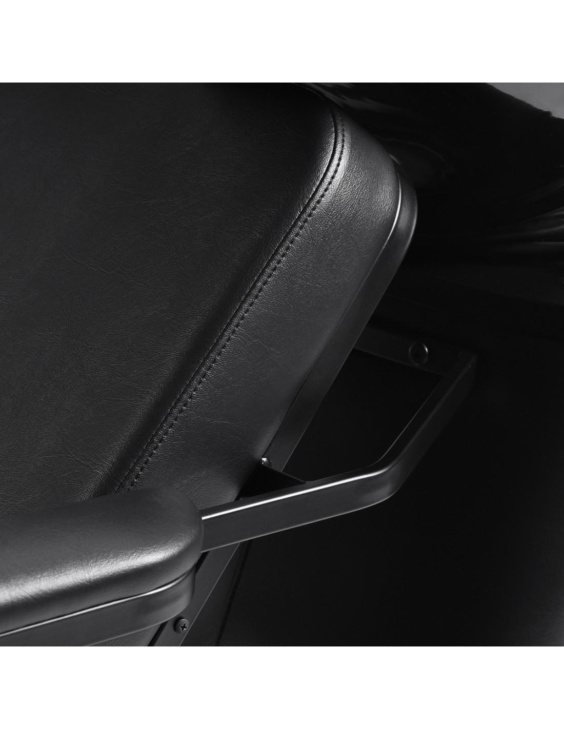 La poltrona sagomata offre un sostegno lombare e un elevato comfort di utilizzo, mentre i braccioli imbottiti consentono il corretto posizionamento delle spalle del cliente. La schiuma resistente alle deformazioni, combinata con la pelle sintetica nera piacevole al tatto, garantisce comfort, durata e facilità di pulizia del mobile per lungo tempo. Il design moderno della lavatrice conferisce all'interno un carattere unico, mentre la rubinetteria completa nei toni del nero - rubinetto, doccetta e tubi dedicati - fornisce un set completo di strumenti per il lavoro.