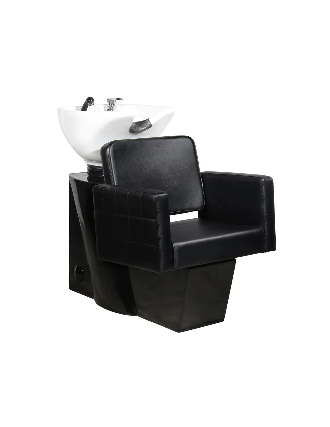 Lavabo professionale per parrucchieri - stabile, estremamente confortevole, di solida fattura. Il suo design moderno lo rende un bellissimo complemento all'attrezzatura di un moderno salone da parrucchiere. La seduta è realizzata in ecopelle di alta qualità con interessanti cuciture laterali. Il cuscinetto in silicone stabilizza la testa del cliente e permette di posizionarla comodamente sul lavatesta. La vasca del lavatesta è bianca, con la possibilità di regolarne l'inclinazione. Lavatrice in nero.