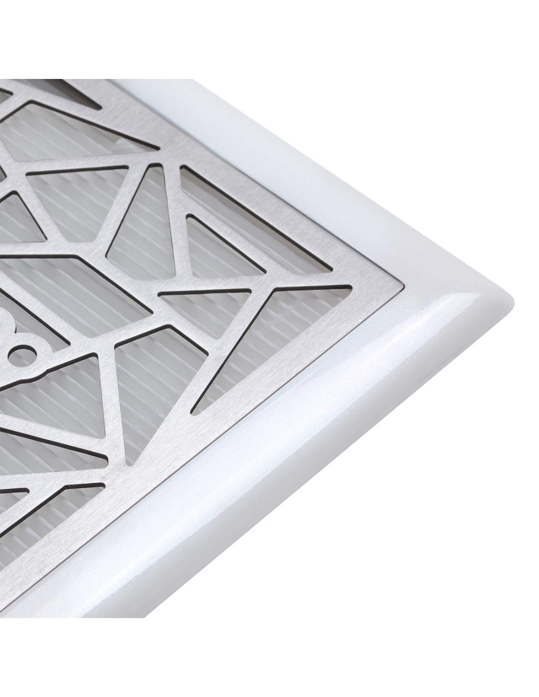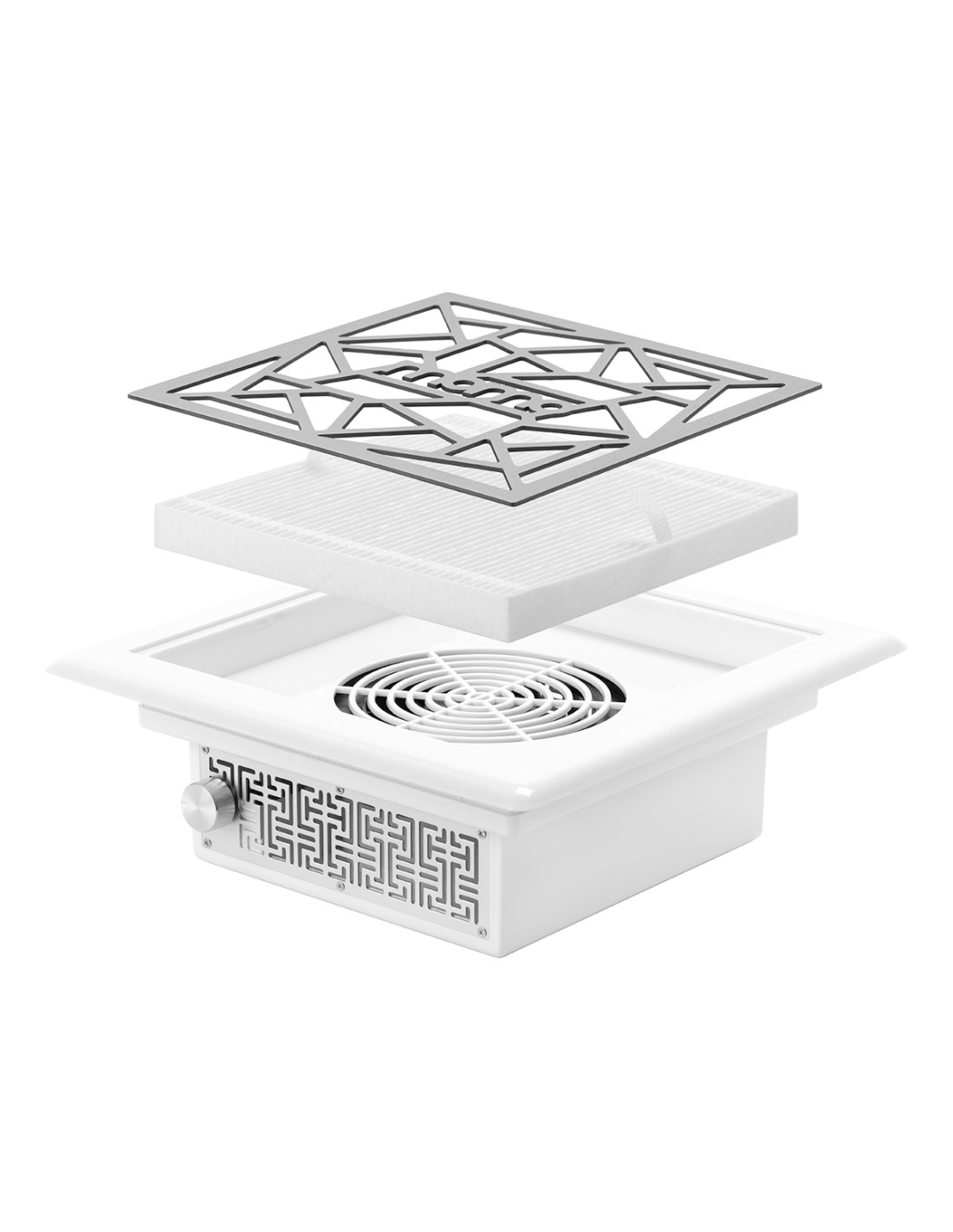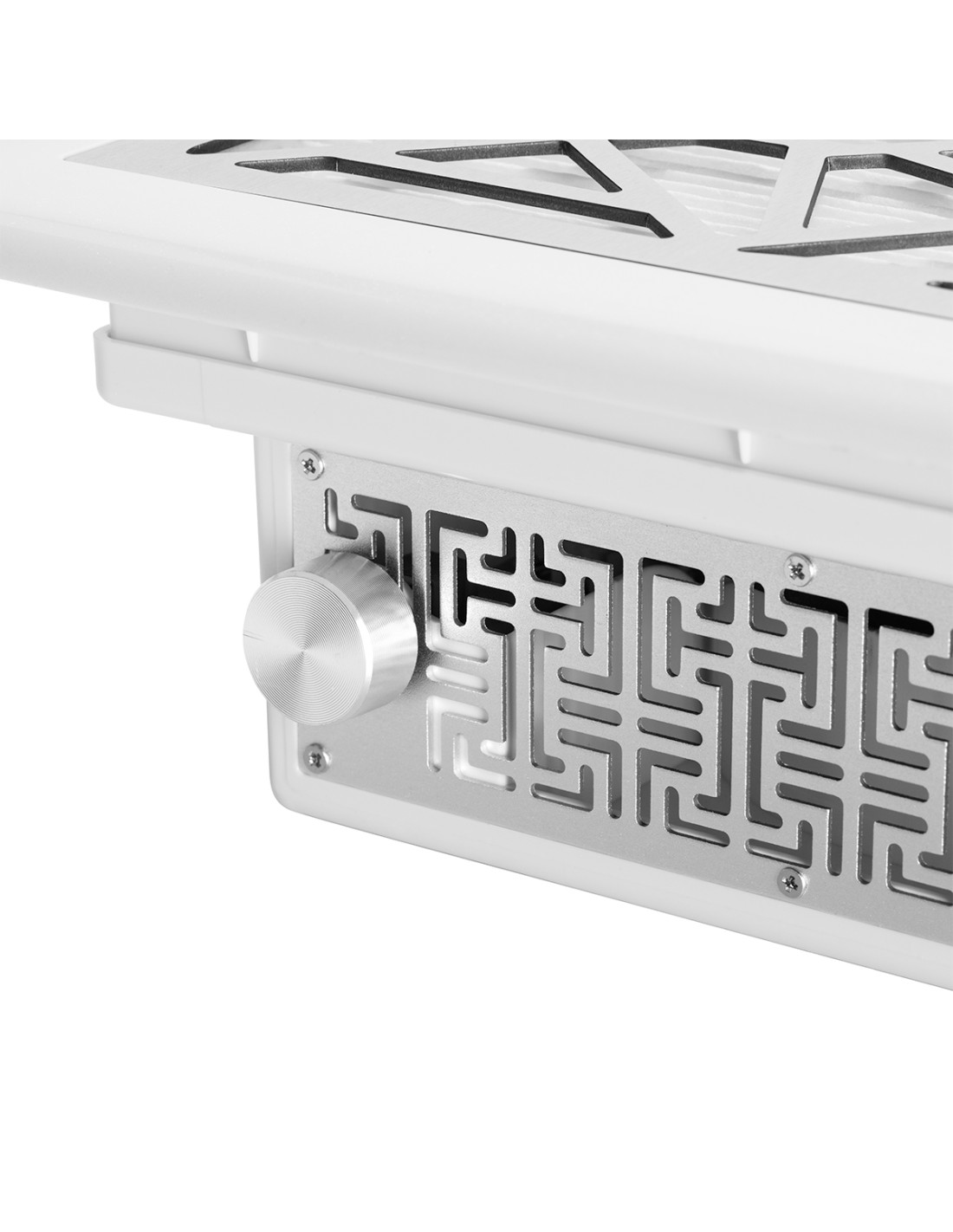 Questo modello combina funzionalità e stile moderno. Il design semplice e ben congegnato e la mascherina metallica con un motivo dal design interessante conferiscono al dispositivo un carattere futuristico che attira l'attenzione dei clienti e distingue il salone dalla concorrenza. L'assorbitore ha un aspetto estremamente elegante, ma è anche resistente, durevole e facile da pulire. La forma minimalista non solo si inserisce perfettamente negli interni moderni, ma aumenta anche l'ergonomia della postazione di lavoro, rendendo il dispositivo un elemento pratico dell'arredamento di ogni salone di nail art.