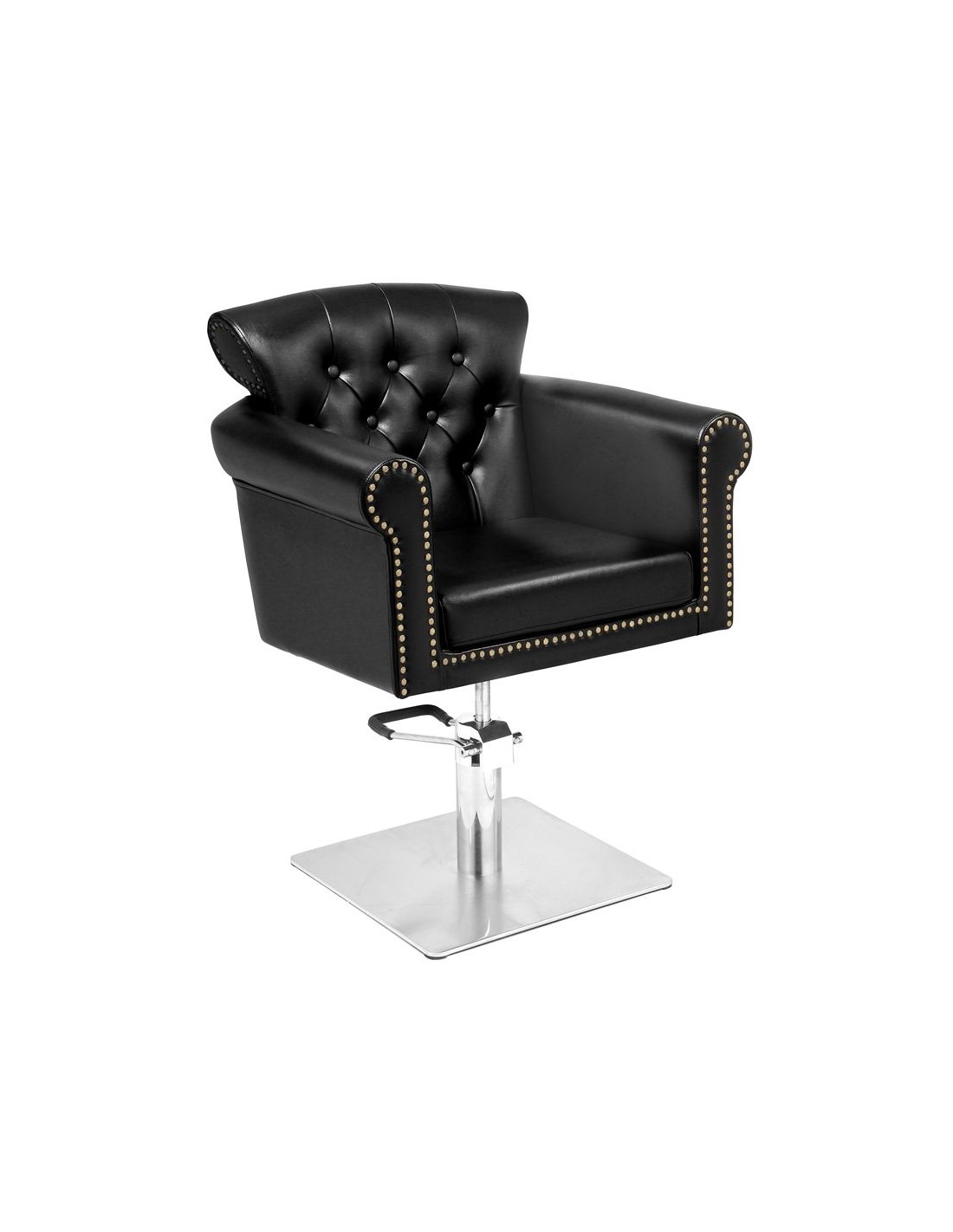 Una poltrona per parrucchieri di stile.  Molto confortevole, si adatta perfettamente agli interni di saloni eleganti.  Regolabile sul piano verticale. Molto stabile e solida. Il rivestimento è in ecopelle nera di alta qualità. L'eleganza di questa poltrona è completata da una base quadrata in acciaio INOX di alta qualità.      Dimensioni: 77 x 72 x 65 cm