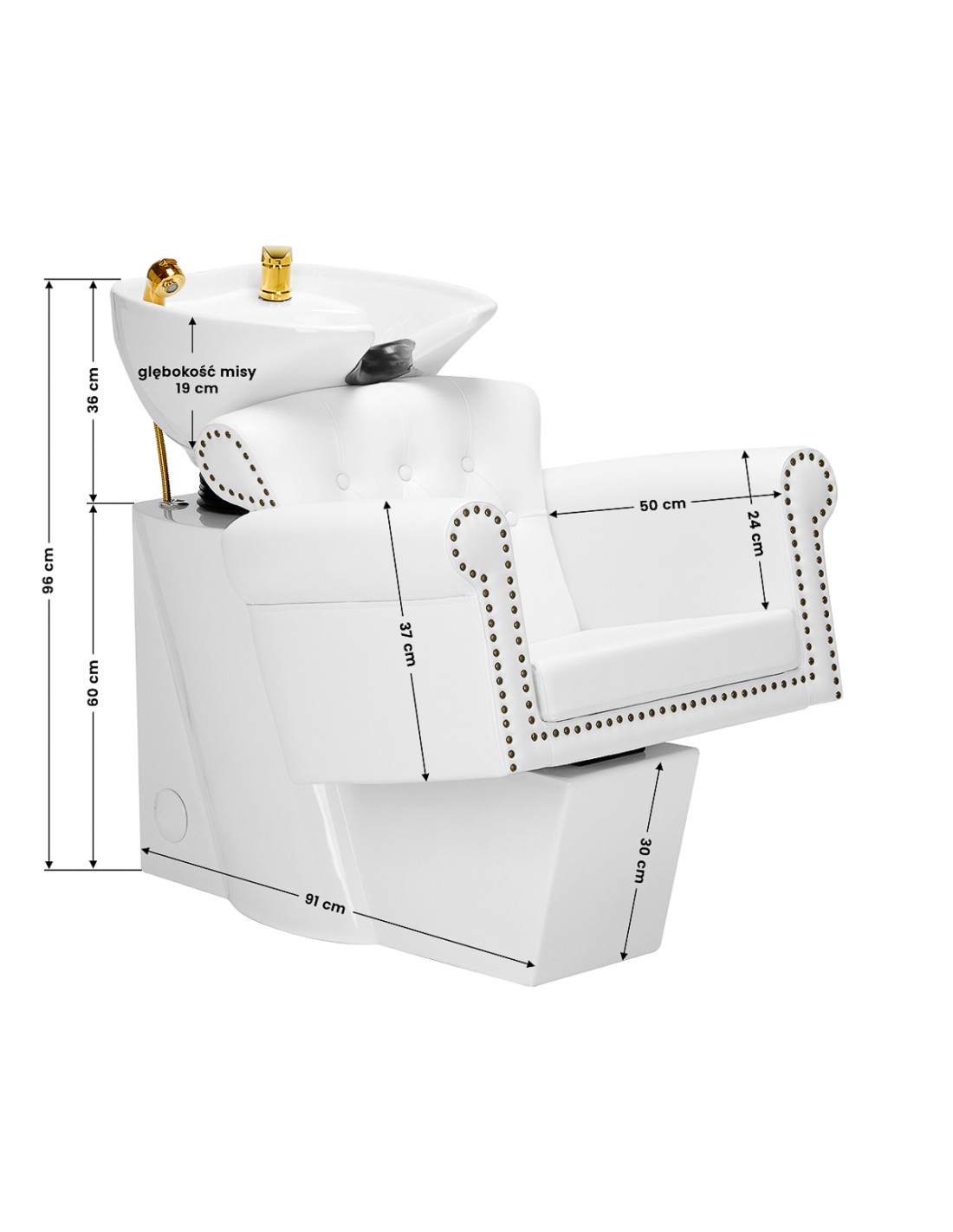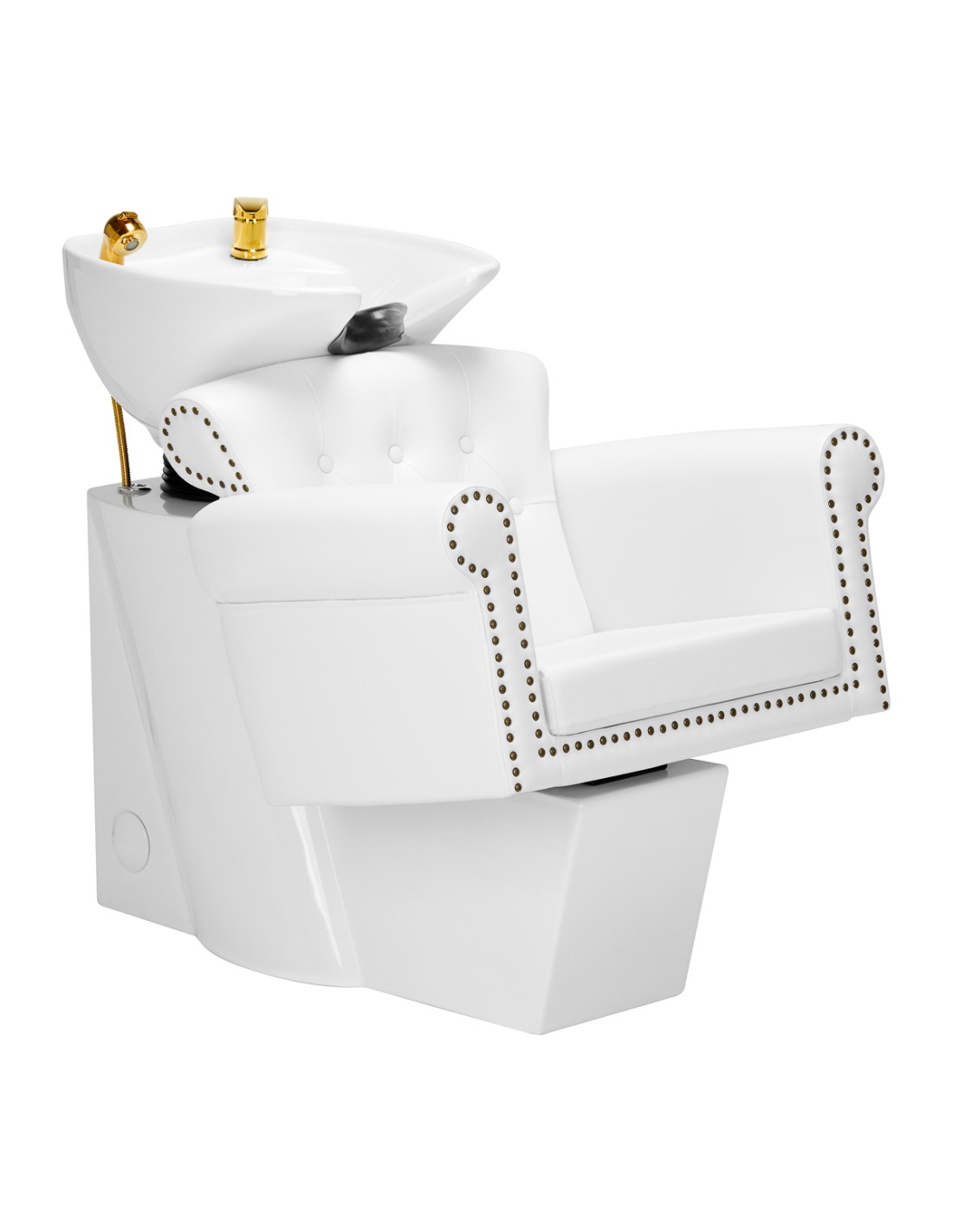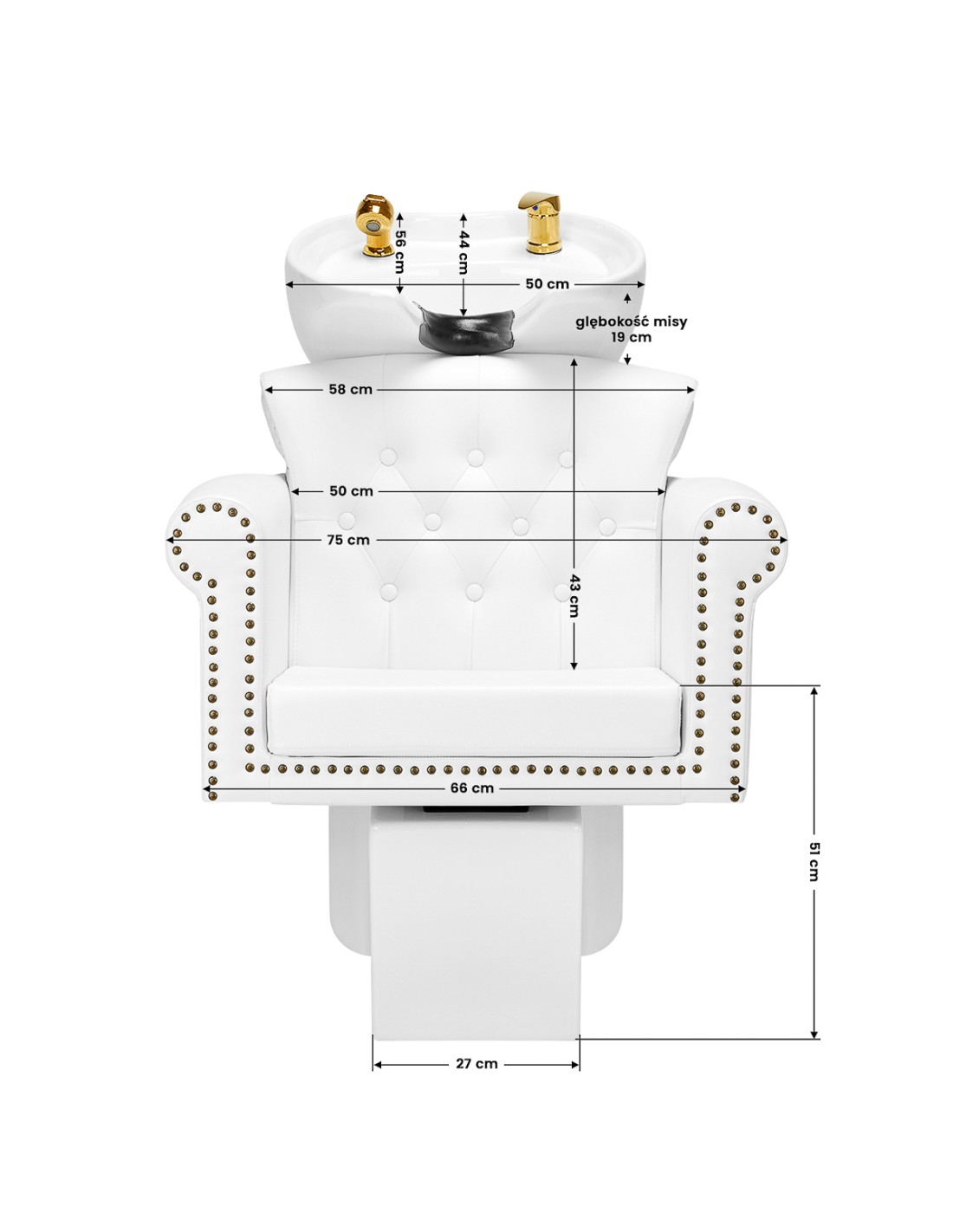Una poltrona adeguatamente profilata e riempita di schiuma resistente offre un sostegno adeguato e, di conseguenza, un elevato comfort di utilizzo. I braccioli consentono di posizionare correttamente le spalle del cliente. Il rivestimento in pelle sintetica di colore bianco, piacevole al tatto, garantisce una lunga durata e una facile pulizia. Il design originale ed elegante dell'autolavaggio con trapuntatura decorativa ed elementi dorati conferisce all'interno un'espressione unica. La dotazione completa di accessori in tonalità oro comprende un miscelatore, una cornetta per la doccia e tubi flessibili dedicati per garantire un set completo di strumenti per il lavoro.