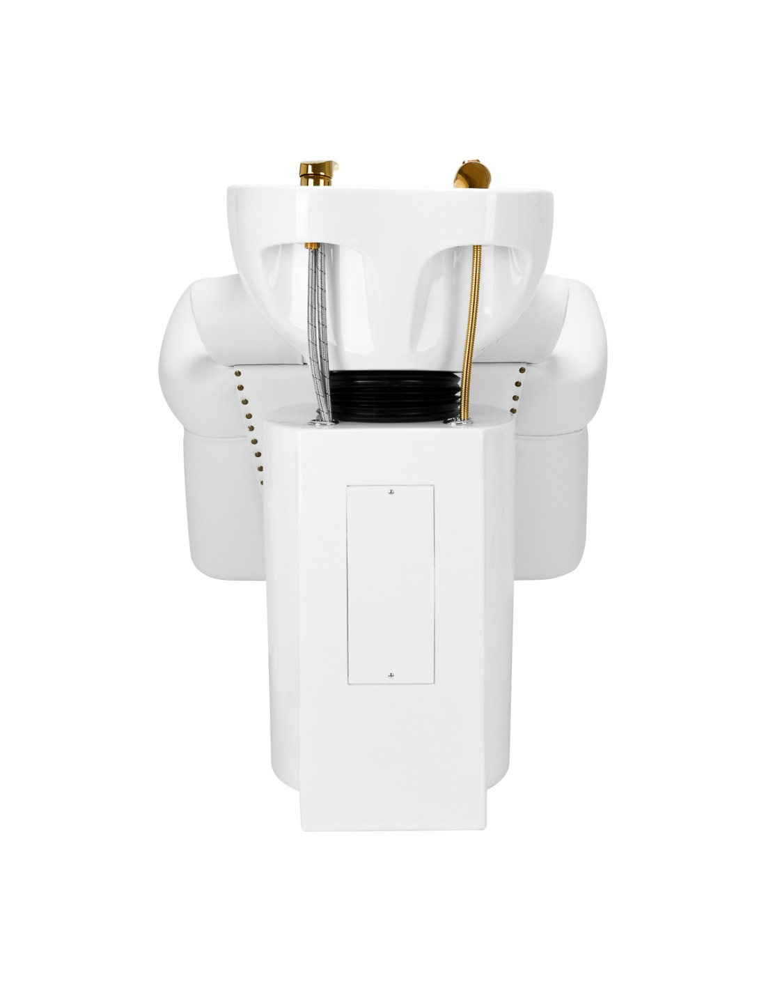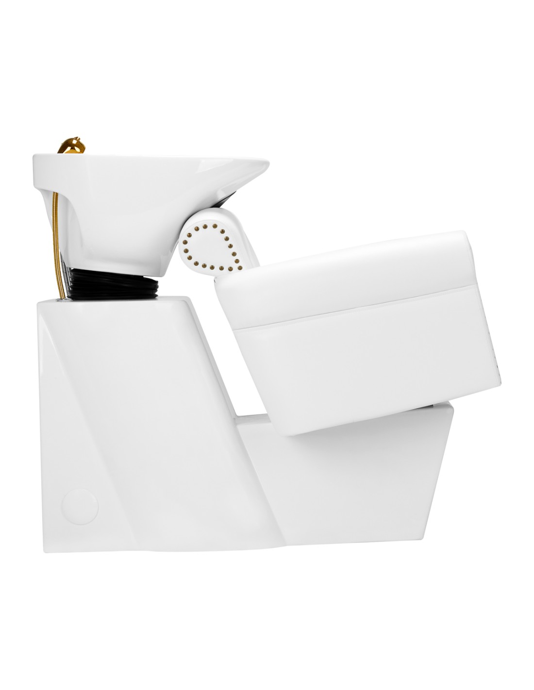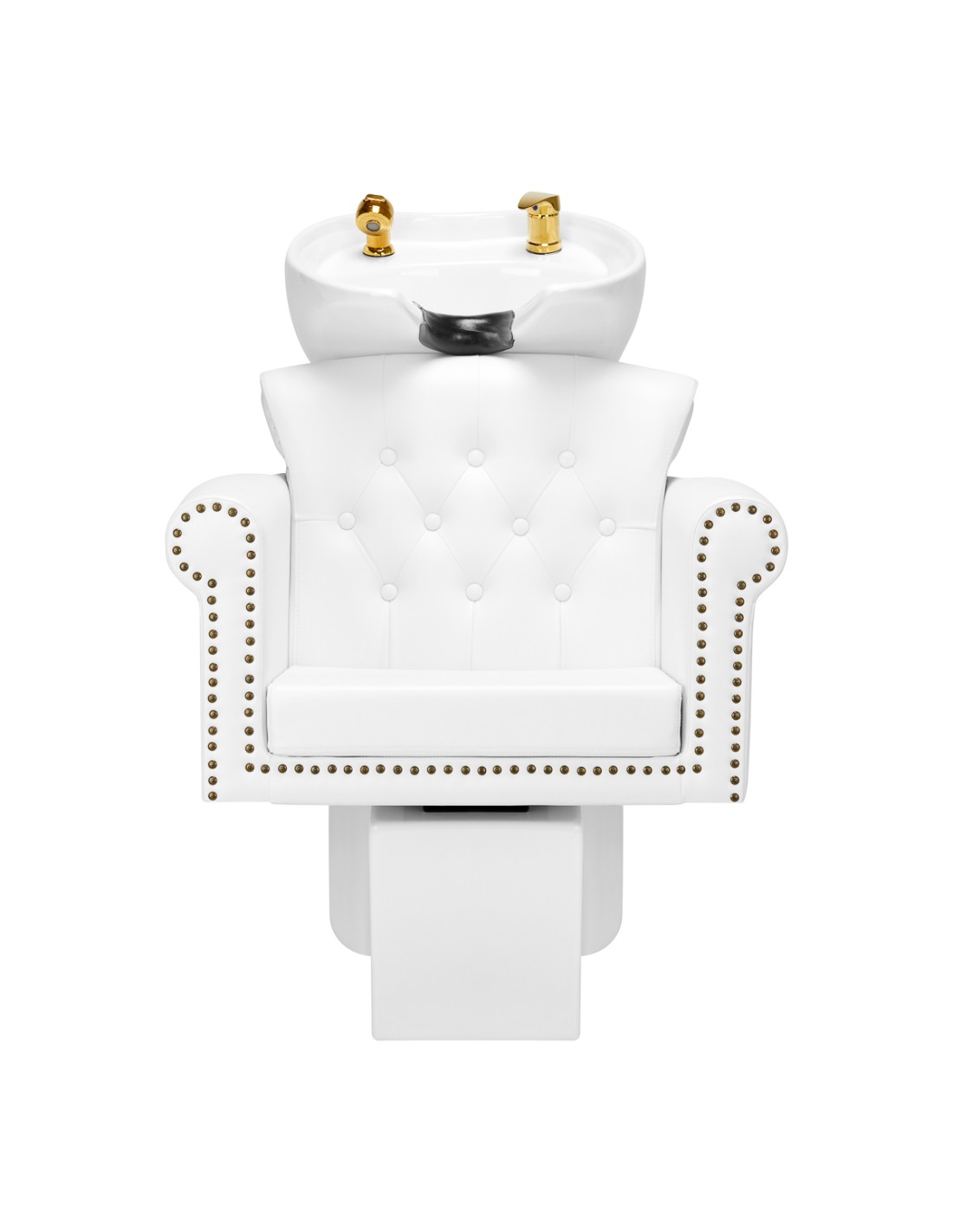 Una poltrona adeguatamente profilata e riempita di schiuma resistente offre un sostegno adeguato e, di conseguenza, un elevato comfort di utilizzo. I braccioli consentono di posizionare correttamente le spalle del cliente. Il rivestimento in pelle sintetica di colore bianco, piacevole al tatto, garantisce una lunga durata e una facile pulizia. Il design originale ed elegante dell'autolavaggio con trapuntatura decorativa ed elementi dorati conferisce all'interno un'espressione unica. La dotazione completa di accessori in tonalità oro comprende un miscelatore, una cornetta per la doccia e tubi flessibili dedicati per garantire un set completo di strumenti per il lavoro.