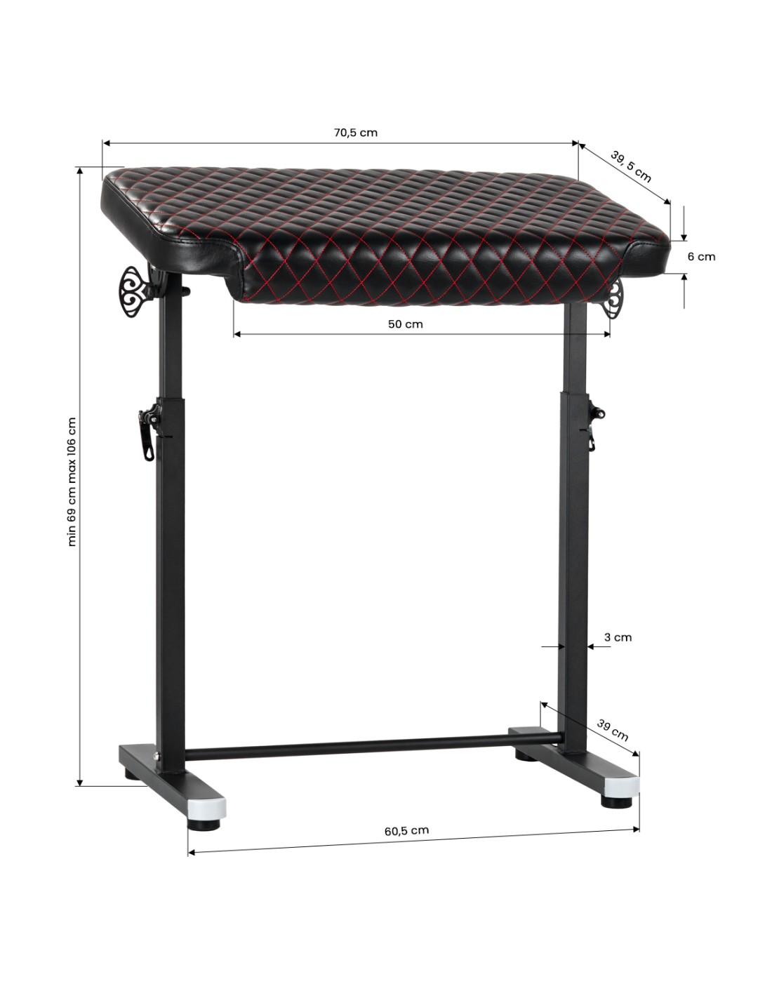 Il bracciolo è regolabile in altezza da 69 a 106 cm, consentendo di adattarlo ai diversi clienti e garantendo un supporto ottimale durante le sessioni di tatuaggio. Grazie alla funzione di regolazione dell'inclinazione, il posizionamento del bracciolo può essere adattato alle esigenze individuali del cliente e alle caratteristiche del trattamento, offrendo un comfort ancora maggiore durante il tatuaggio.
