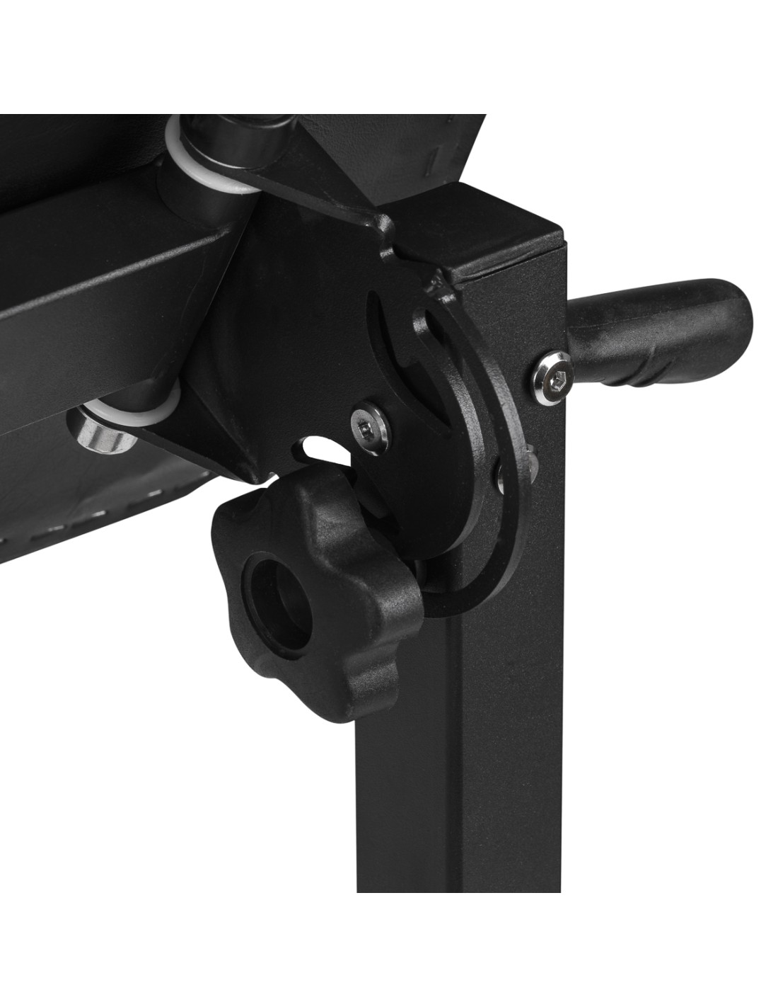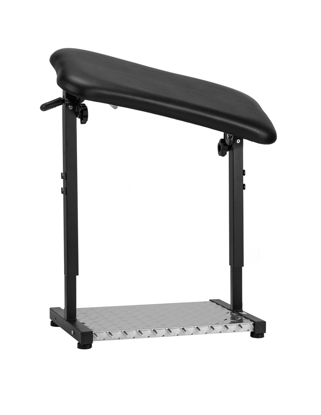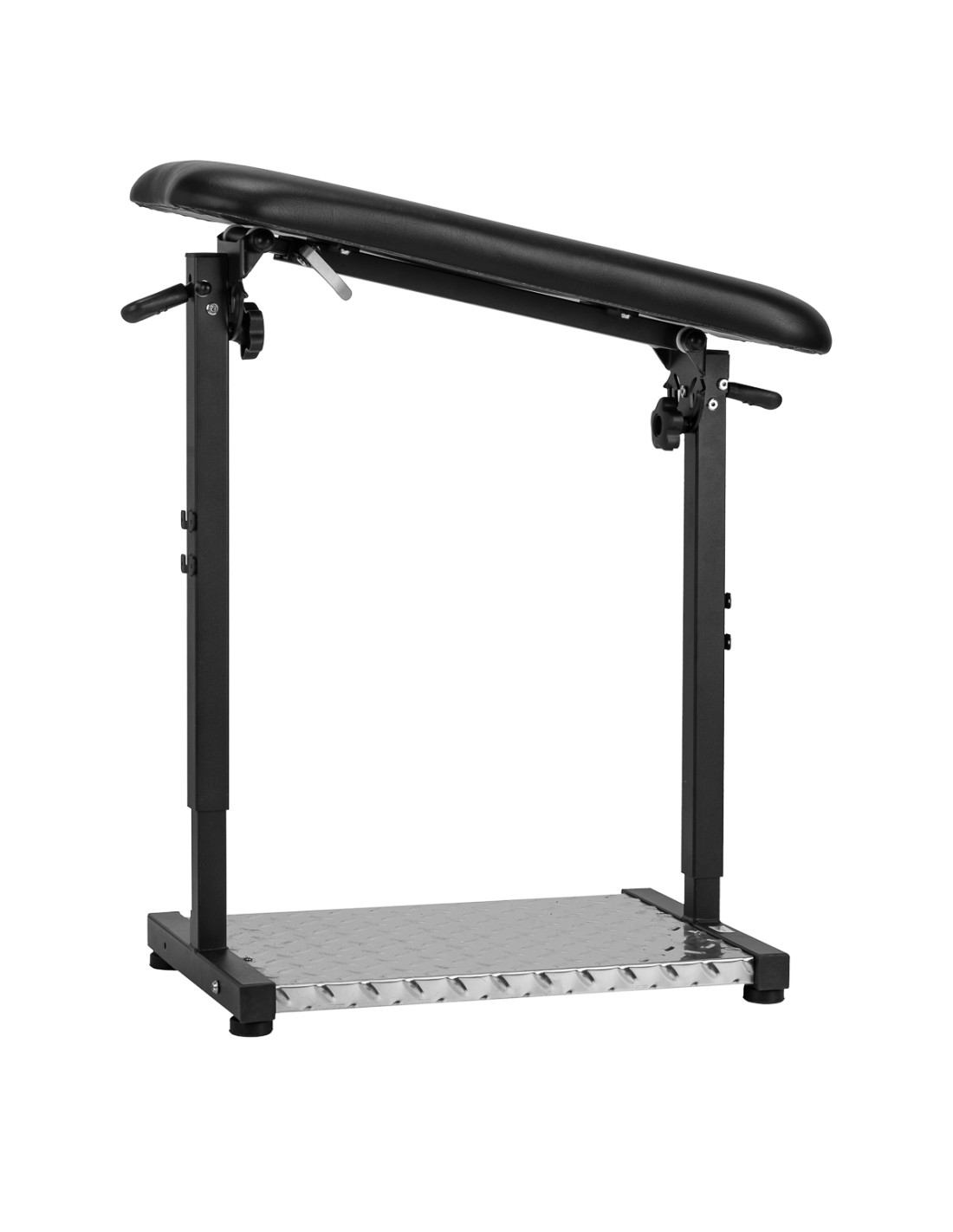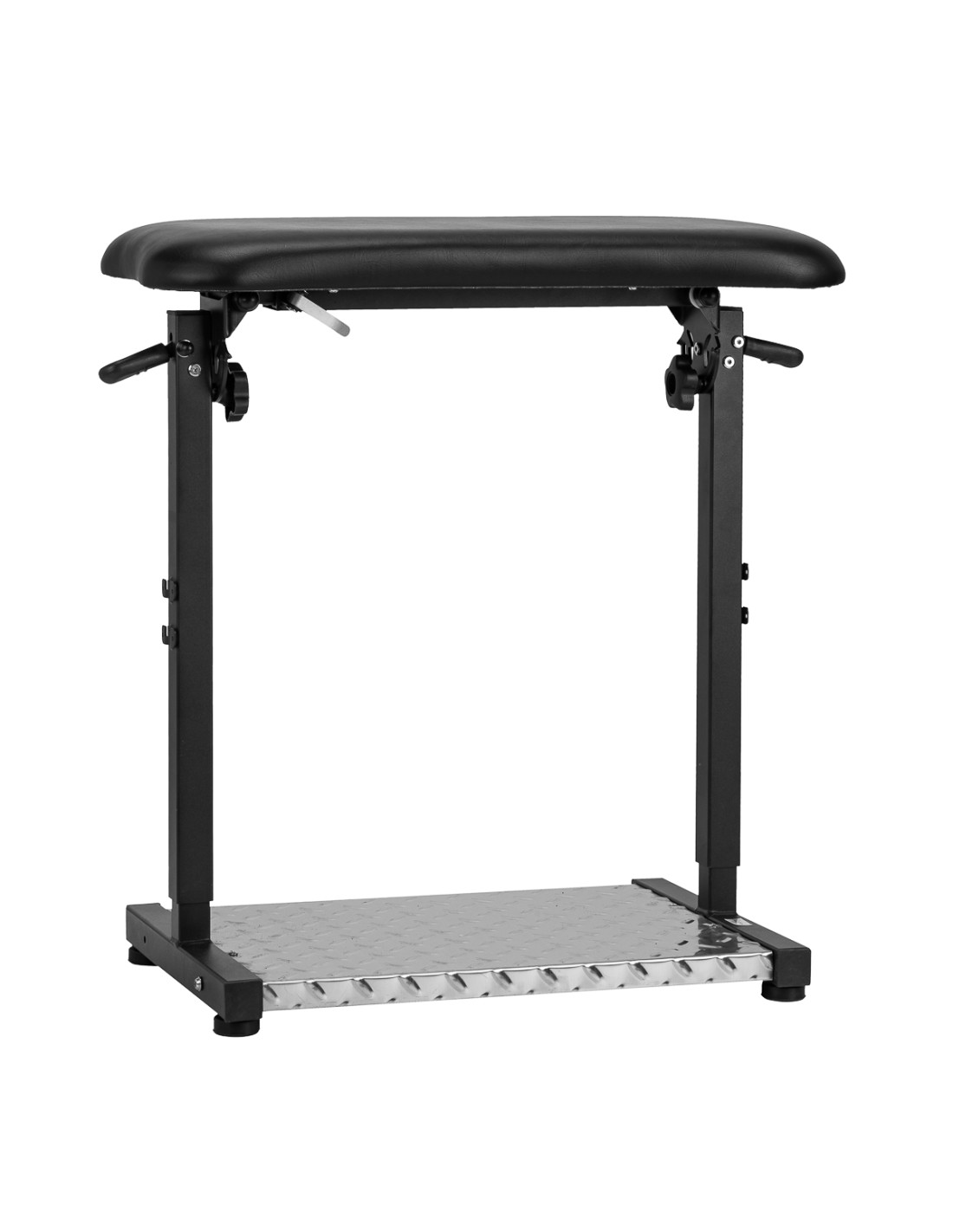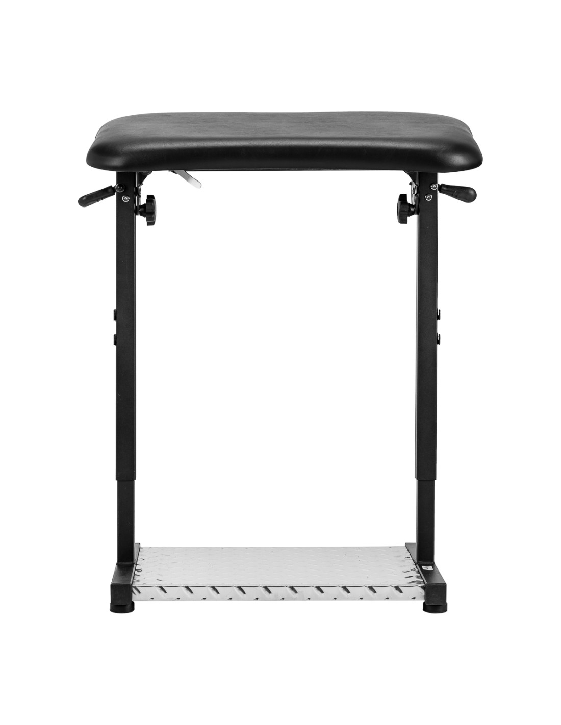 L'altezza del bracciolo può essere regolata tra i 69 e i 95 cm, consentendo di adattarlo alle esigenze dei clienti e garantendo un supporto stabile durante le sedute. La regolazione dell'inclinazione del bracciolo fino a 180° (90° per ogni lato) e la possibilità di regolare l'altezza di entrambi i lati in modo indipendente grazie ai sollevatori a gas incorporati, consentono un posizionamento ottimale del supporto. L'ampia gamma di regolazioni aumenta notevolmente l 'ergonomia e il comfort. Il poggiapiedi in metallo facilita una posizione confortevole per il tatuatore o il cliente. Inoltre, la possibilità di montare un vassoio per gli accessori sul telaio e un supporto per i guanti e l'asciugamano aumenta la funzionalità di questo modello.