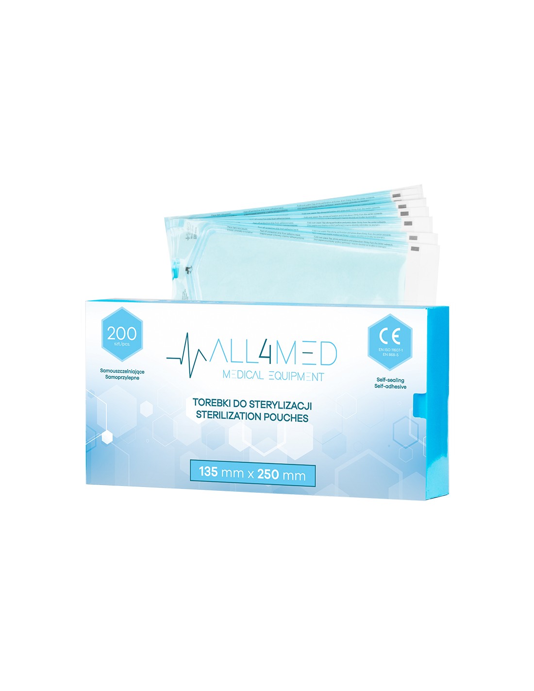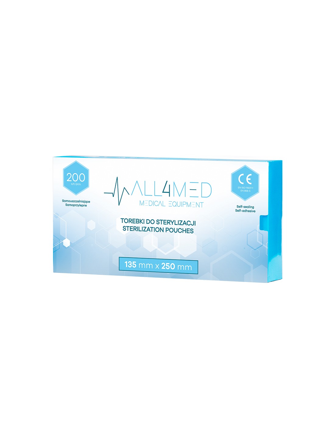Le buste autoadesive ALL4MED di alta qualità sono realizzate con materiali che soddisfano tutti gli standard medici richiesti. Sono dotate di un nastro autoadesivo grazie al quale non è necessario utilizzare un saldatore. L'indicatore posto sul prodotto confermerà il corretto svolgimento della sterilizzazione cambiando colore. Le buste sono progettate per la sterilizzazione a vapore.