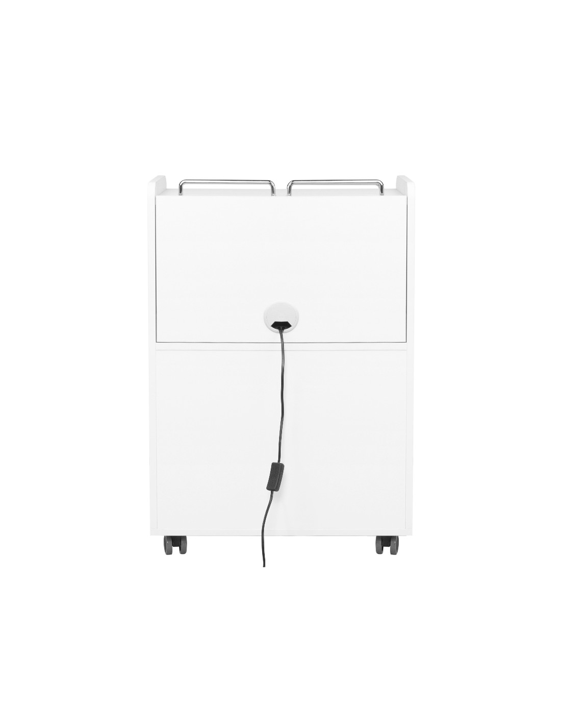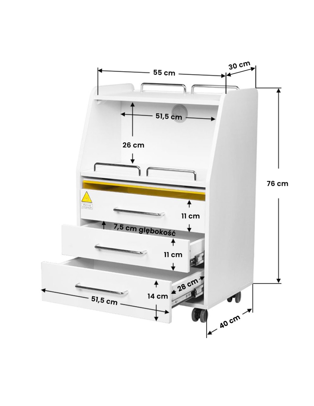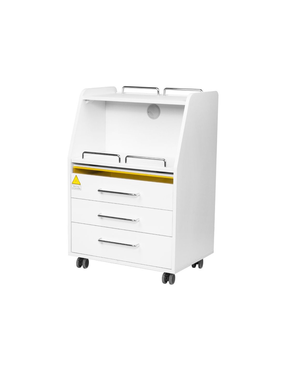 L'ausilio podologico di alta qualità è un funzionale mobile cosmetico su ruote. Grazie alla sua mobilità, è possibile trasportarlo in altre sale di trattamento. L'ausilio è dotato di cassetti per gli strumenti e gli accessori e di un ripiano estraibile per la fresatrice podologica o altri dispositivi. Un cassetto è dotato di una lampada UV-C integrata per una migliore sterilità di strumenti e accessori.