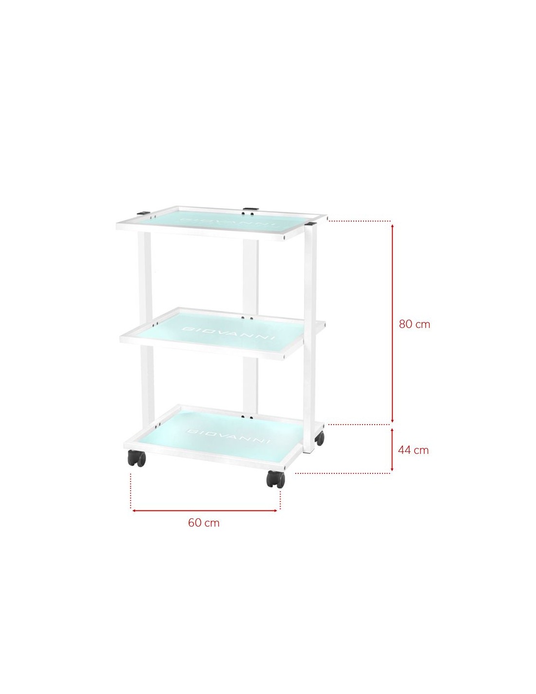 con rotelle gommate. Ha tre ripiani in vetro con incisione del logo GIOVANNI. È possibile applicare una lampada d'ingrandimento. Dimensioni: