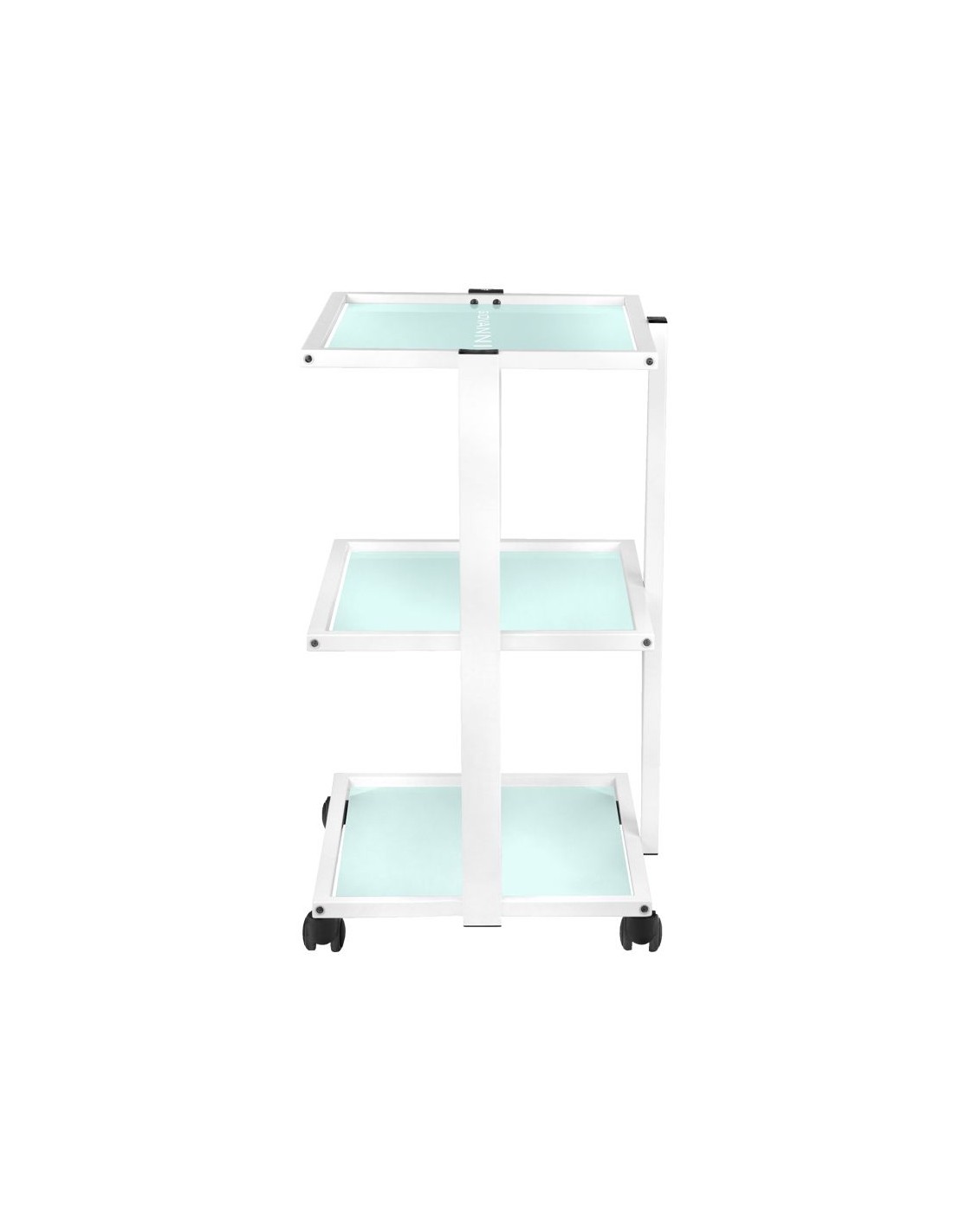 con rotelle gommate. Ha tre ripiani in vetro con incisione del logo GIOVANNI. È possibile applicare una lampada d'ingrandimento.