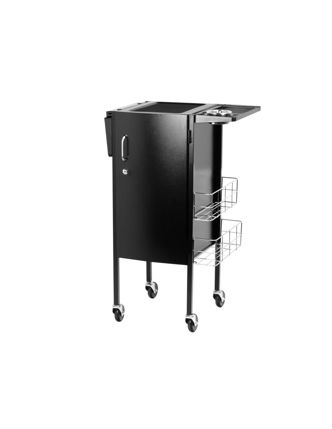 Elegante aiutante del parrucchiere con armadietto con serratura. Pratico e soprattutto molto capiente. È dotato di 4 ruote in gomma. Su entrambi i lati dell'armadietto sono presenti cestini in metallo per accessori pratici come l'asciugacapelli. Nell'armadietto sono presenti 5 spaziosi cassetti che consentono di organizzare tutti i piccoli oggetti. Nella parte superiore, inoltre, sono presenti due ripiani pieghevoli in rilievo in cui è possibile riporre in modo sicuro gli accessori o i prodotti per il trattamento. Il mobile ideale per ogni parrucchiere, per il quale sono importanti un elevato livello di comfort e l'estetica del salone.