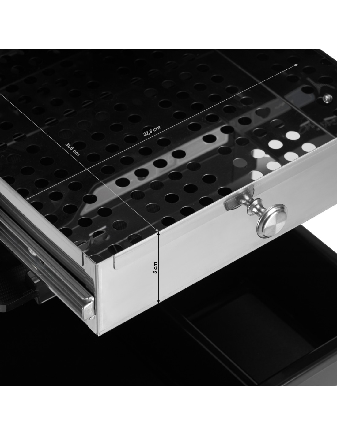 Il capiente organizer è dotato di un set di vassoi per tenere in ordine la postazione di lavoro e organizzare gli utensili per parrucchieri. Il set comprende sei contenitori: due senza scomparti, due con scomparti e due stretti e profondi. La loro disposizione all'interno dell'organizer può essere modificata a piacimento in base alle proprie esigenze e la vasta scelta di cassetti di diverso tipo consente di ordinare gli utensili come si desidera. Inoltre, i due cassetti più profondi possono essere posizionati a diverse altezze sui lati dell'organizer, in modo che gli utensili in essi contenuti siano sempre al giusto livello. Lo schienale coperto impedisce che i cassetti vengano accidentalmente estratti dalla parte opposta, con il rischio di danneggiare gli utensili all'interno.