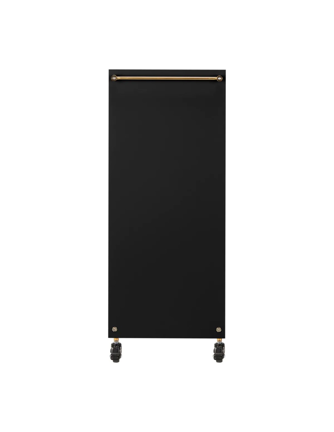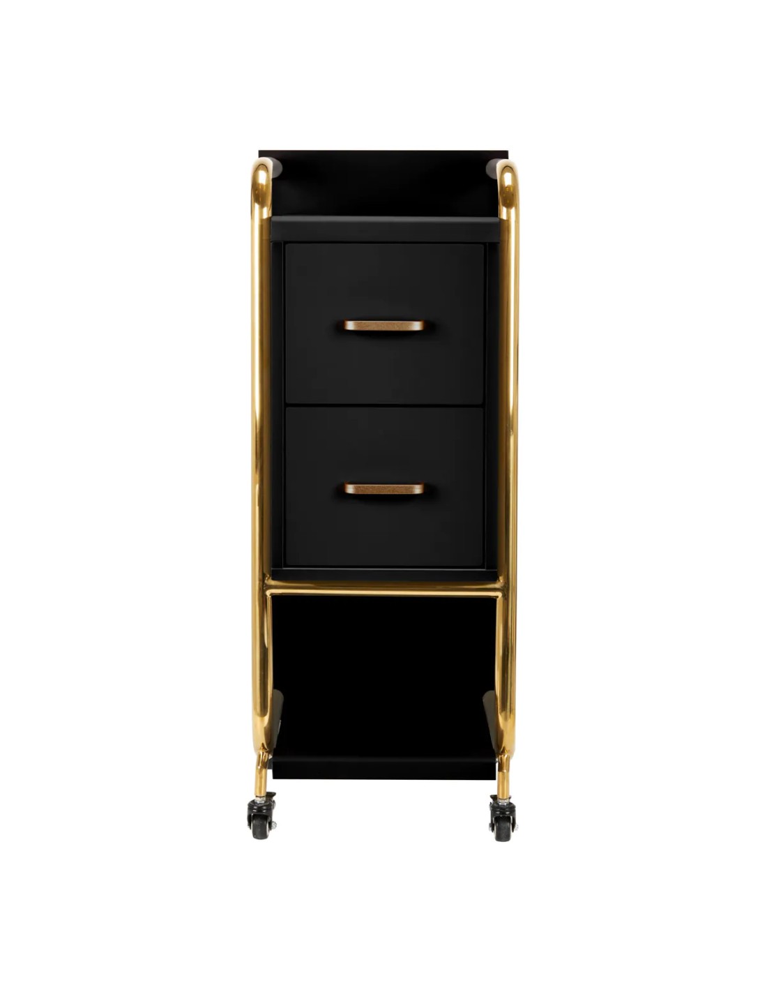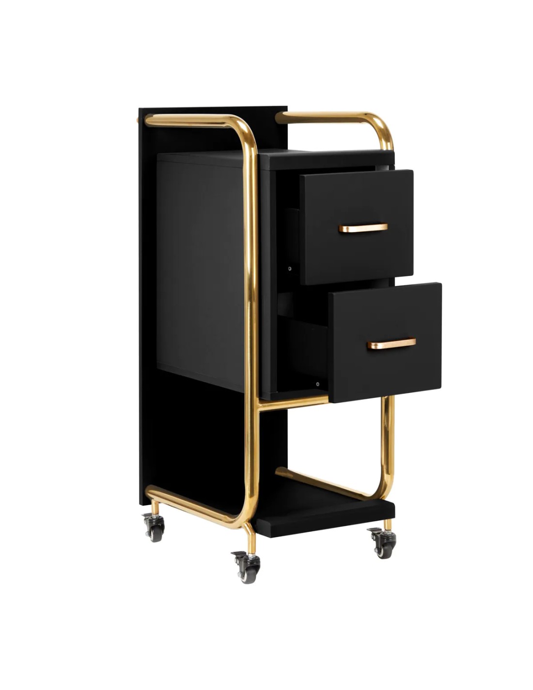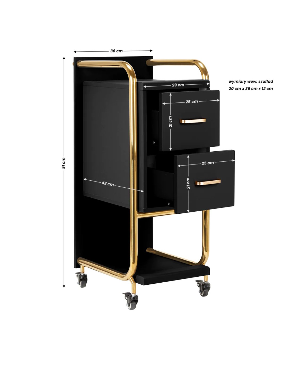 L'assistente per parrucchieri di alta qualità Gabbiano Solo è un'attrezzatura elegante che migliora notevolmente il lavoro in un salone di parrucchieri. Due capienti cassetti e due ripiani di diverse dimensioni facilitano notevolmente l'organizzazione dei prodotti e degli strumenti necessari. Le ruote gommate con freno assicurano un'adeguata mobilità, consentendo di posizionare liberamente il mobile in qualsiasi punto del salone. Il design elegante - elementi metallici lucidi nei toni dell'oro e una struttura stabile in pannelli di legno nei toni del nero - sottolineerà perfettamente il carattere degli interni.
