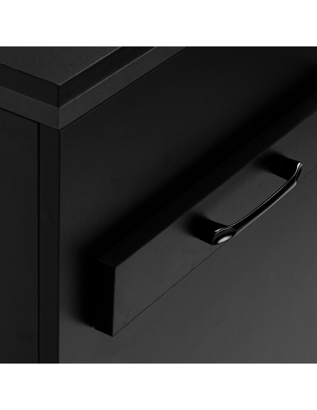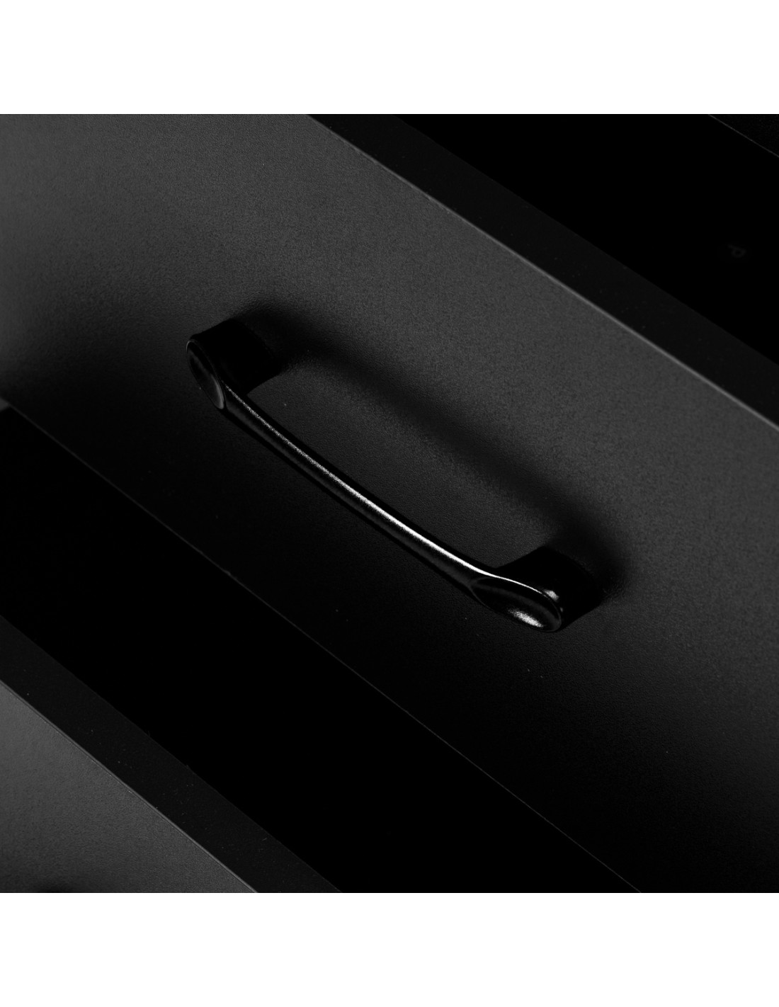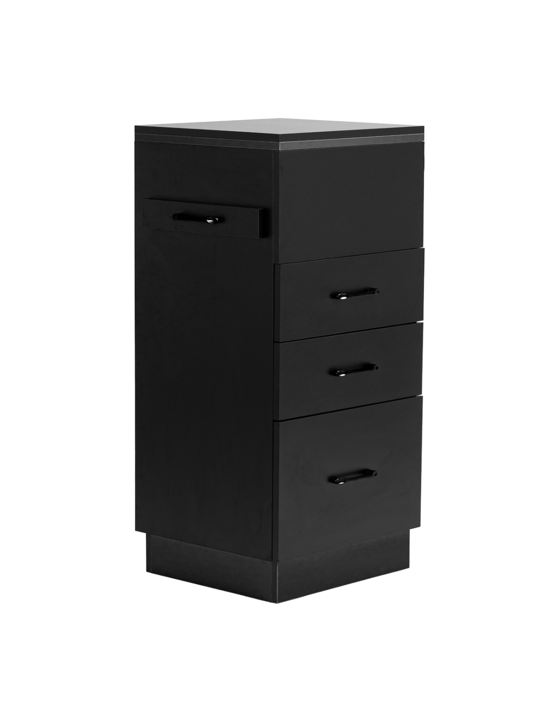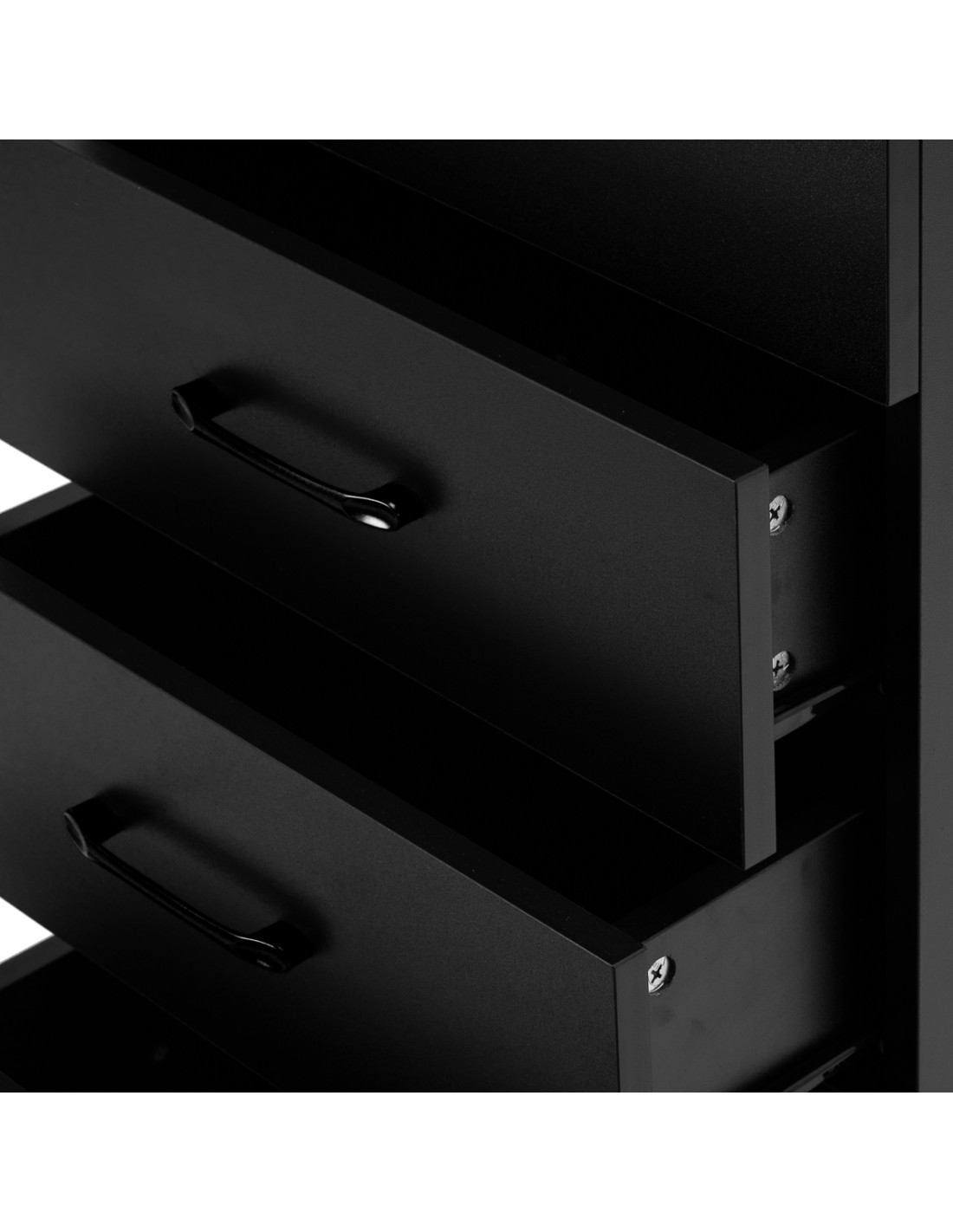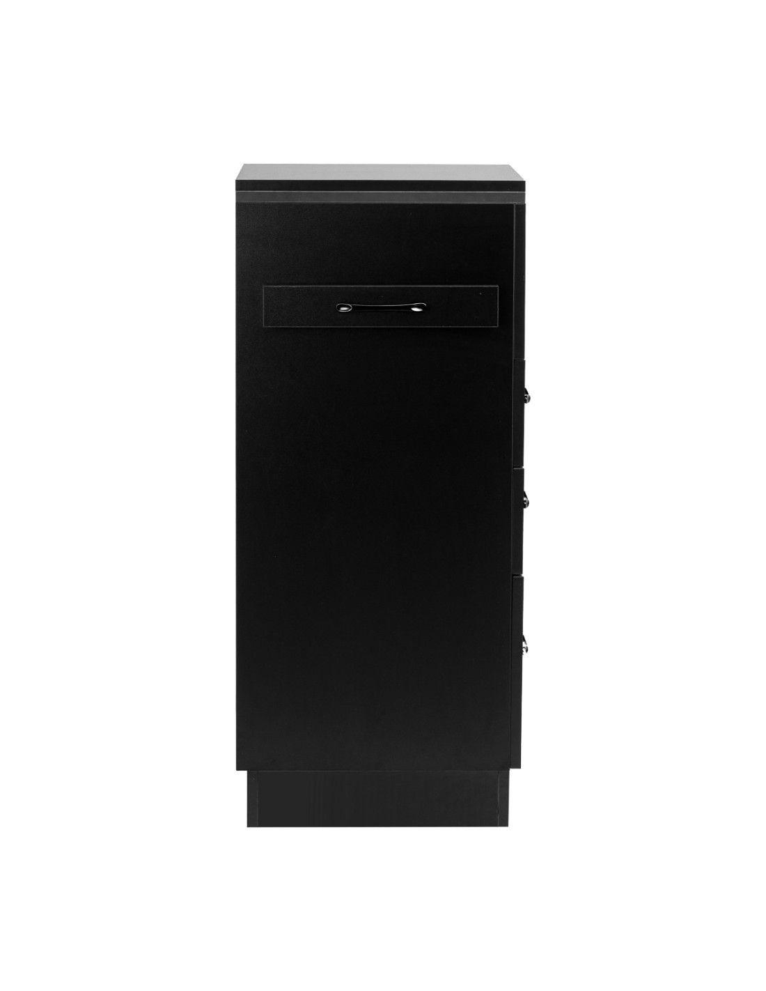 L'accostamento del nero classico conferisce all'helper un carattere moderno e prestigioso, che si adatta perfettamente sia ad allestimenti minimalisti che a quelli più espressivi. La struttura solida garantisce stabilità, mentre la superficie liscia facilita la pulizia del mobile. Le maniglie nere non solo sottolineano il design elegante, ma garantiscono anche una comoda apertura di ogni cassetto. È una soluzione pratica per un salone di parrucchieri, dove l'ordine, il comodo accesso agli strumenti e l'estetica della postazione di lavoro sono importanti.