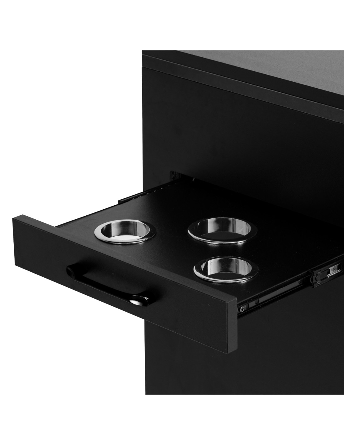 L'helper è dotato di un ulteriore cassetto laterale estraibile con portautensili in metallo. Le tre aperture sono perfette per contenere asciugacapelli, arricciacapelli, piastre o spazzole, consentendo di riporre comodamente le attrezzature durante il trattamento. Questa soluzione consente di accedere liberamente agli strumenti più necessari senza doverli riporre sulla superficie di lavoro.