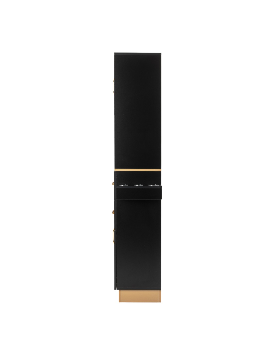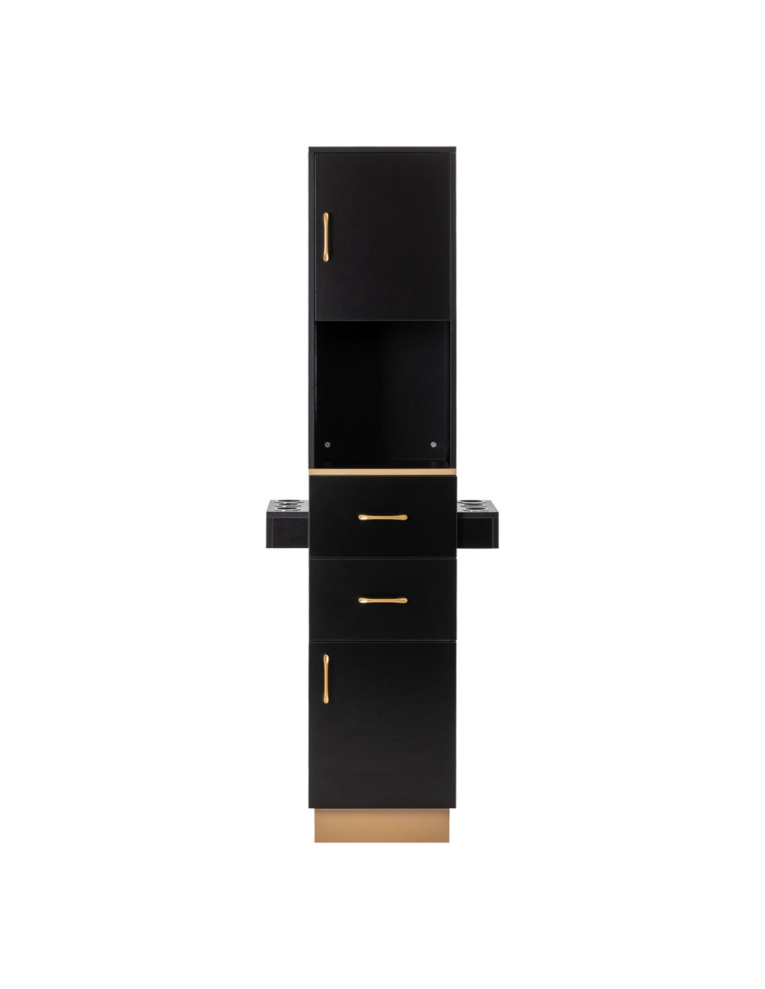 La postazione da parrucchiere Gabbiano Totem è un elemento funzionale progettato pensando all'ergonomia del lavoro e all'organizzazione ordinata della postazione. Il modello sottolinea il carattere professionale dell'ambiente e favorisce un'efficiente organizzazione dello spazio di lavoro. La forma minimalista, mantenuta nei toni del nero e spezzata da dettagli dorati, conferisce al mobile un aspetto elegante e lussuoso, che si inserisce perfettamente negli allestimenti moderni dei saloni di parrucchiere e dei barbershop.