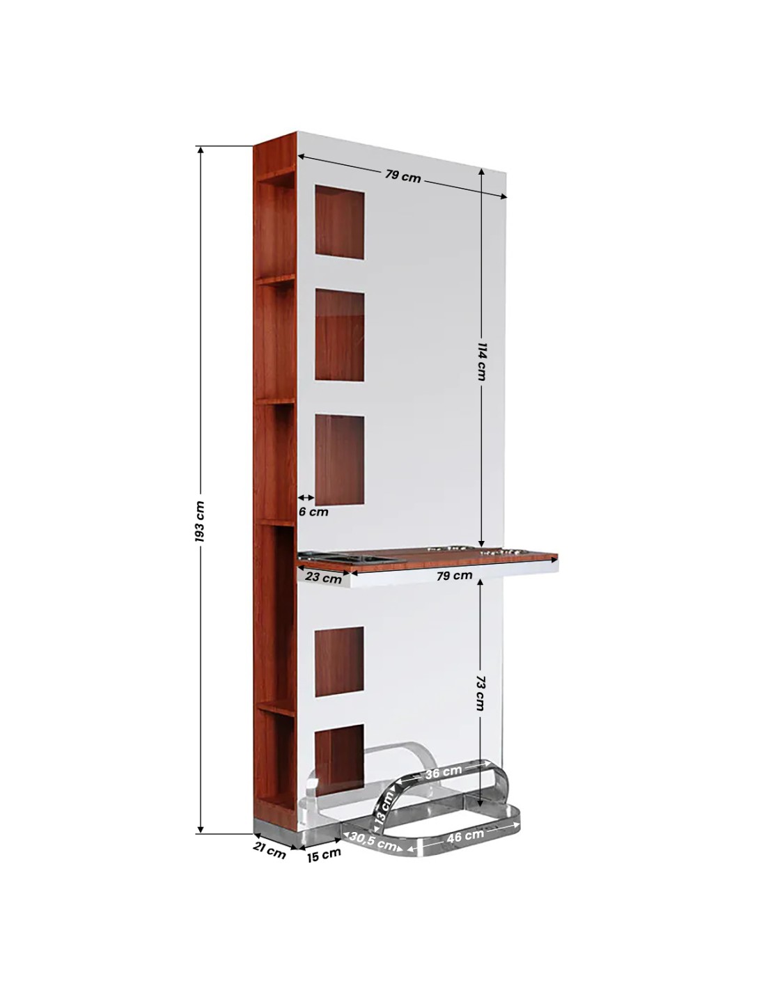 Moderna consolle per parrucchieri con ampio specchio e comodi ripiani su entrambi i lati. Il contenuto dei ripiani su un lato è visibile attraverso le "finestre" Finitura di alta classe. Un elemento d'arredo elegante e allo stesso tempo versatile che esalterà il carattere di ogni salone.