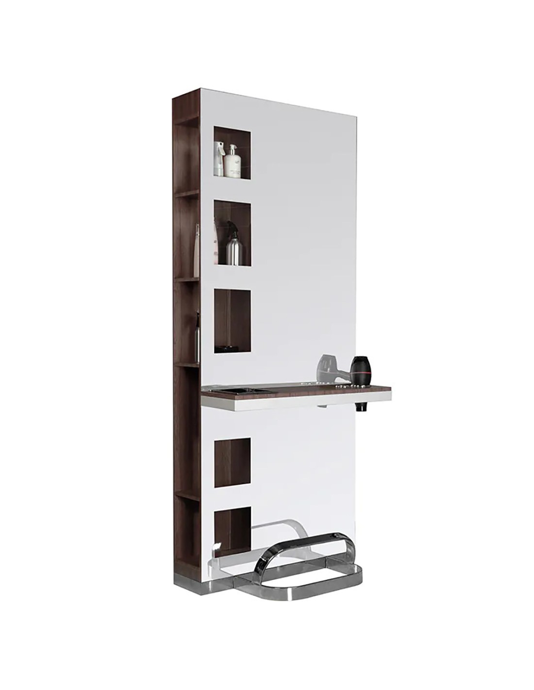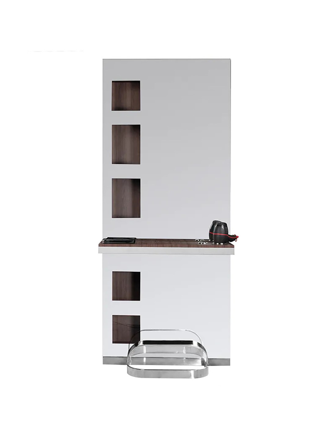 Moderna consolle per parrucchieri con ampio specchio e comodi ripiani su entrambi i lati. Il contenuto dei ripiani su un lato è visibile attraverso le "finestre" Finitura di alta classe. Un elemento d'arredo elegante e allo stesso tempo versatile che esalterà il carattere di ogni salone.