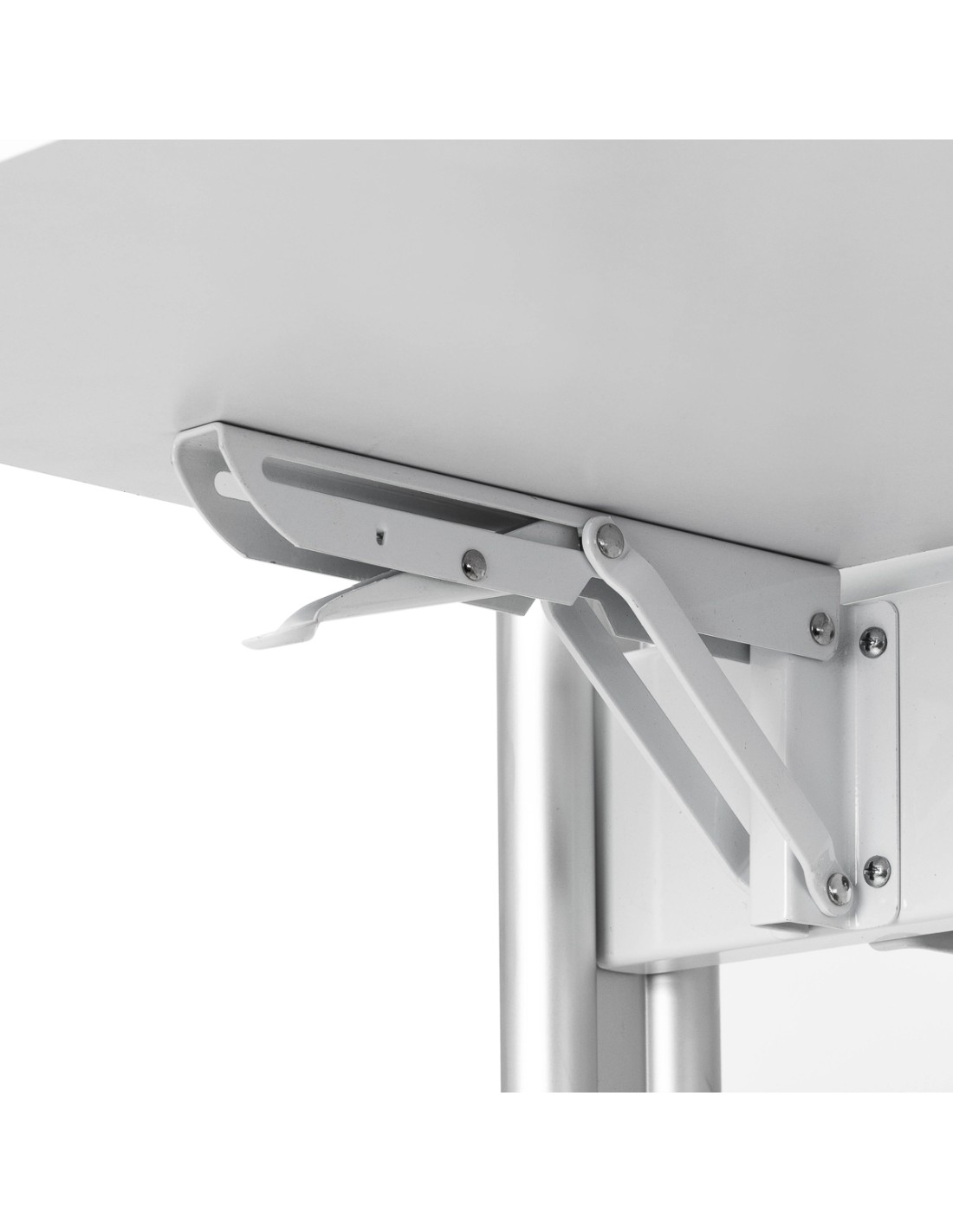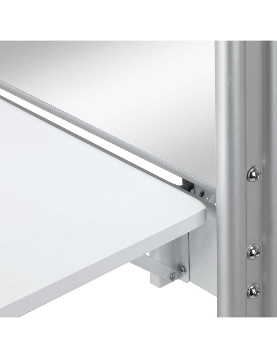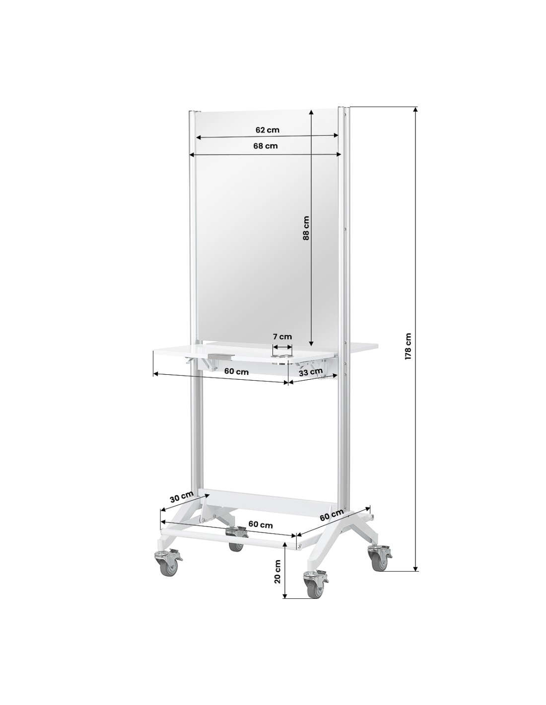 Il pratico ripiano pieghevole ad un'altezza di 90 cm è uno dei principali vantaggi della consolle MI-03, che consente di risparmiare spazio offrendo al contempo uno spazio di archiviazione funzionale. Inoltre, il design bifacciale e le rotelle bloccabili garantiscono la mobilità e la facilità di riposizionamento della console. I fori sul ripiano fungono da supporto per l'asciugacapelli, rendendo la console ancora più pratica e adatta alle esigenze dei professionisti dell'acconciatura.