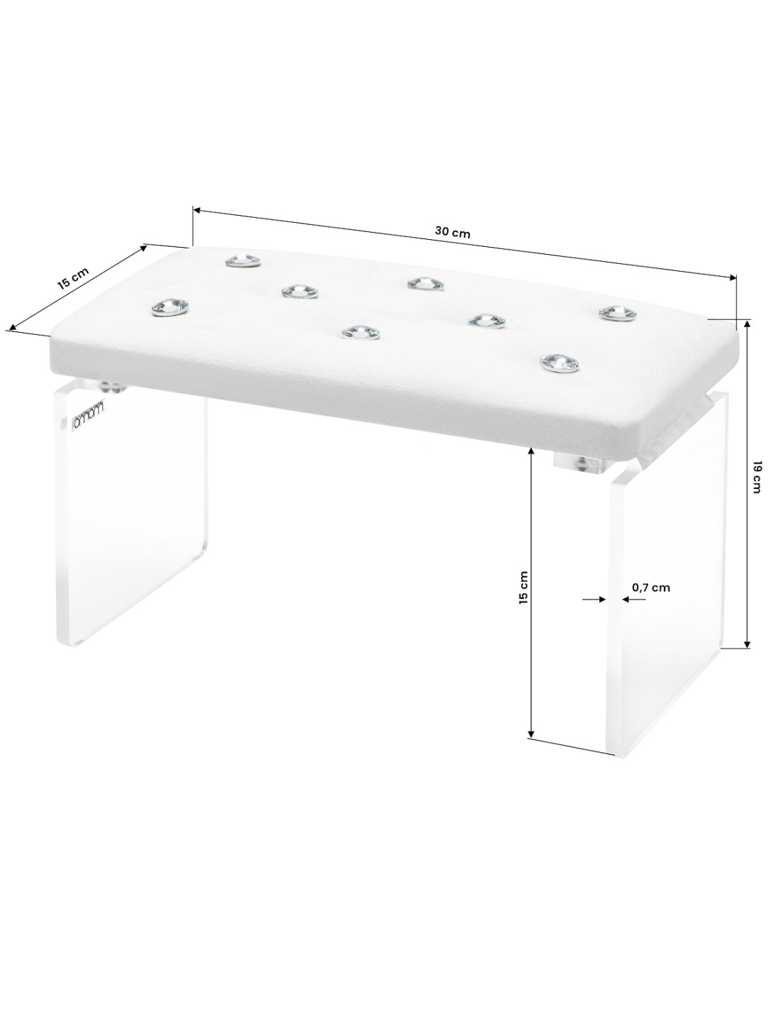 L'altezza corretta del supporto assicura una posizione confortevole sia per la cliente che per l'estetista. La corretta postura dell'acconciatore riduce al minimo le sollecitazioni sulla colonna vertebrale, riducendo efficacemente il mal di schiena, mentre il cliente gode di maggiore comfort e relax. Gli elementi in silicone sulle gambe proteggono il piano del tavolo dai graffi e ne impediscono lo scivolamento sul tavolo, garantendo la stabilità. La struttura in plastica e l'elegante velluto assicurano una lunga durata del prodotto, mentre i cristalli decorativi gli conferiscono un aspetto unico.