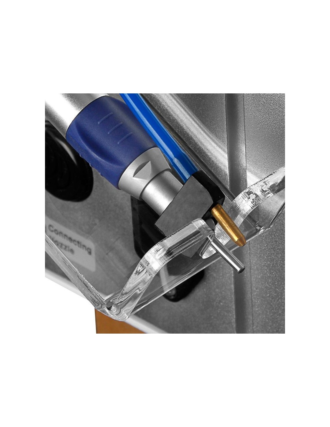 Il contenitore del liquido illuminato ha un volume di 250 ml. È molto facile da rimuovere, pulire e riempire. Il liquido viene immesso in un tubo flessibile collegato all'altro lato. Lo spray collegato alla testina sarà facilmente accessibile durante il trattamento. Regolare l'intensità del getto con la manopola. Accendere o spegnere il getto utilizzando il pulsante sul display.