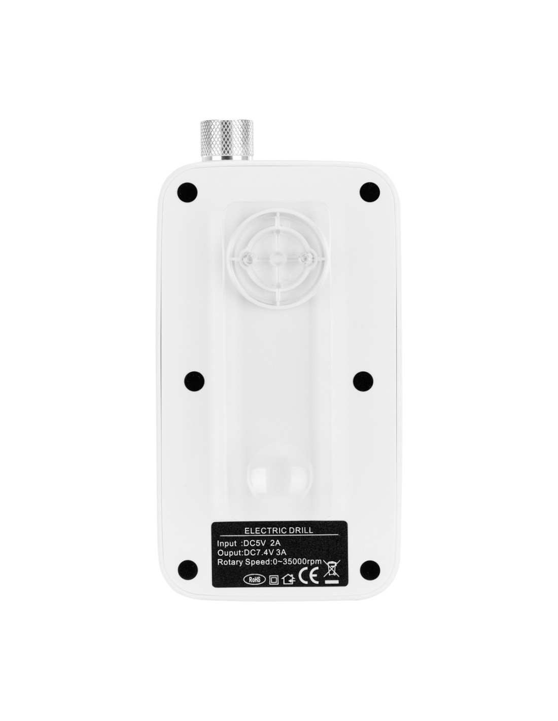 La fresa è maneggevole e leggera, con un involucro in plastica minimalista nei toni del bianco per garantire durata e facilità di manutenzione. Grazie alle sue dimensioni compatte e al peso ridotto, l'unità può essere facilmente riposta in spazi ridotti e trasportata comodamente, il che è particolarmente importante per i fornitori di servizi mobili. Sul retro della custodia è presente una clip che consente di agganciare comodamente il dispositivo a una cintura o in un altro luogo. Inoltre, le caratteristiche antiscivolo sul fondo dell' unità garantiscono una maggiore stabilità durante l'uso.