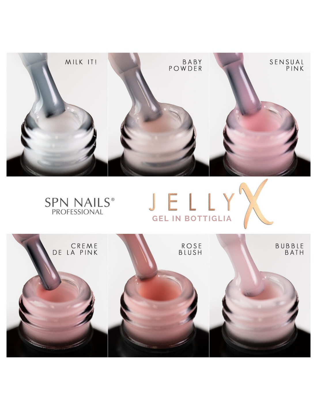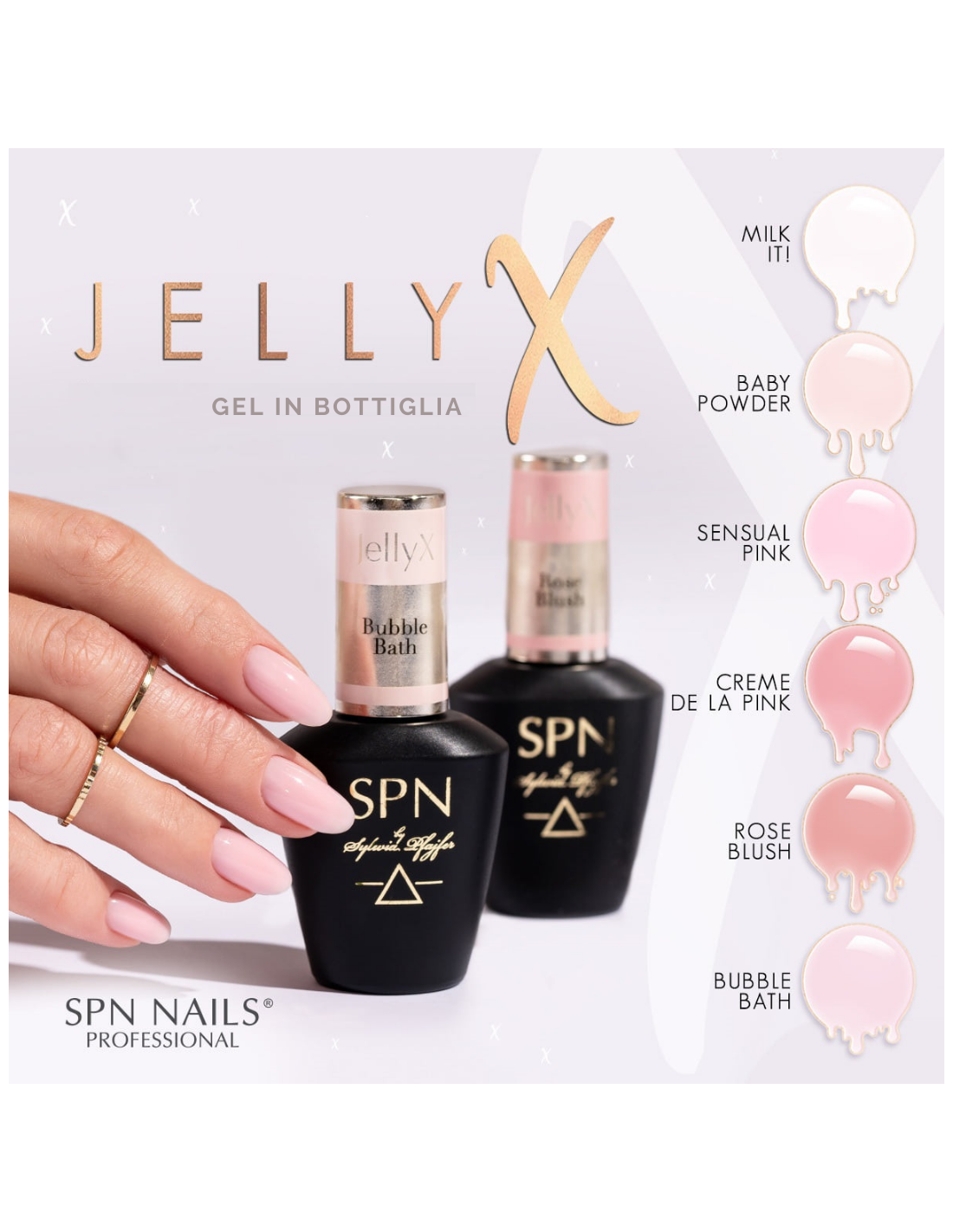 JellyX è un gel medio denso per unghie in bottigllia, resistente, flessibile, facile e veloce da applicare. JellyX è dotato di un pennello grazie al quale in modo preciso potrai allugare le unghie e creare la curva C. JellyX Bubble Bath è di colore rosa nude lattiginoso. Garantirà una finitura naturale e pulita, grazie alla quale le tue mani appariranno ben curate ed eleganti. Non provoca sgradevole sensazione di brucciore durante la polimerizazzione in lampada