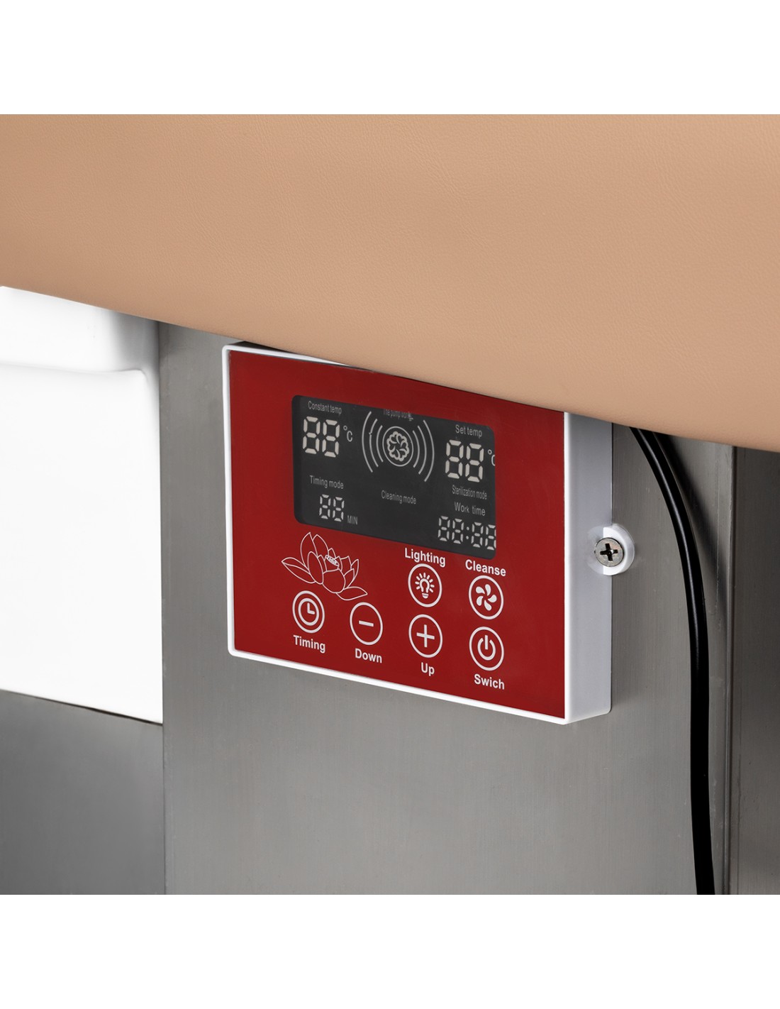 L'intuitivo pannello a sfioramento consente il pieno controllo dei parametri di trattamento, garantendo la praticità d'uso. Permette di regolare il tempo di lavoro e la temperatura dell'acqua e di monitorare i valori correnti. Grazie al display integrato, è possibile verificare in qualsiasi momento la durata del funzionamento dell'apparecchio. Il pannello consente anche di attivare la funzione di terapia della luce, cioè di illuminare la vasca, creando un'atmosfera di relax e lusso. Inoltre, l'unità per la terapia del vapore è dotata di un telecomando per un comodo utilizzo a distanza.