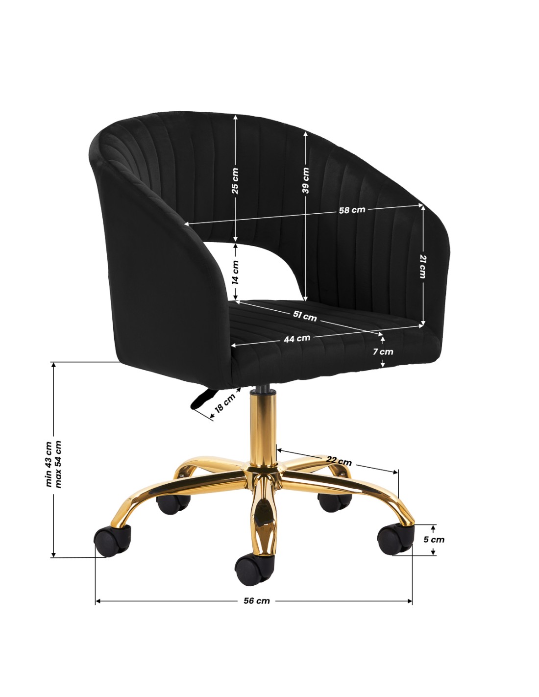 Lafinitura accurata rende il mobile accattivante. Il rivestimento in velluto, piacevole al tatto, nei toni del nero, gli conferisce un carattere unico. La base nei toni dell'oro aggiunge eleganza, integrandosi perfettamente con il velluto, mentre le rotelle funzionali garantiscono la mobilità, facilitando lo spostamento della poltrona e gli spostamenti in salotto durante il lavoro. L'estetica della lavorazione, il comfort d'uso, le cuciture decorative e lo schienale ergonomico fanno sì che la sedia soddisfi le richieste anche degli utenti più esigenti.