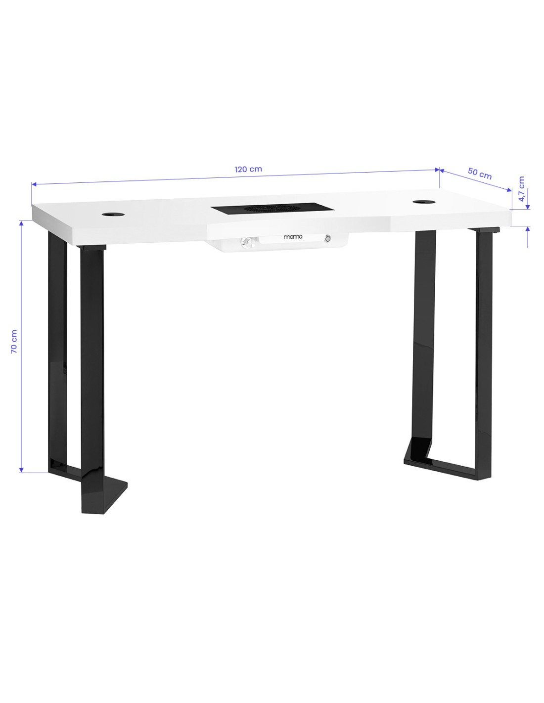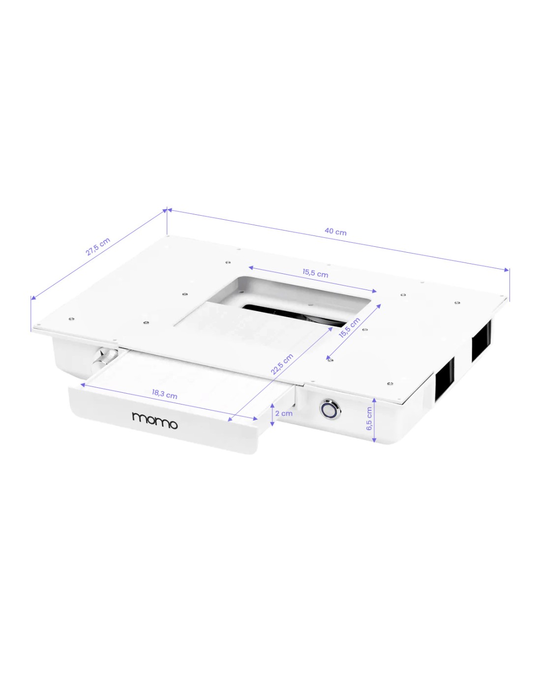 L'assorbitore di polvere a cassetta Momo J-02 integrato nel piano di lavoro migliora notevolmente il comfort e l'igiene, eliminando efficacemente la polvere generata durante i trattamenti cosmetici come la manicure. Con questo dispositivo, l'aria del salone rimane pulita e l'area di lavoro priva di contaminazioni, aumentando la sicurezza sia per l'estetista che per i clienti. L'assorbitore di polvere è facile da usare e da mantenere, il che ne migliora ulteriormente la funzionalità. La pulizia e la sostituzione regolare dei filtri garantiscono un'efficienza di assorbimento sempre elevata. È possibile acquistare filtri di ricambio aggiuntivi (SKU 123581).