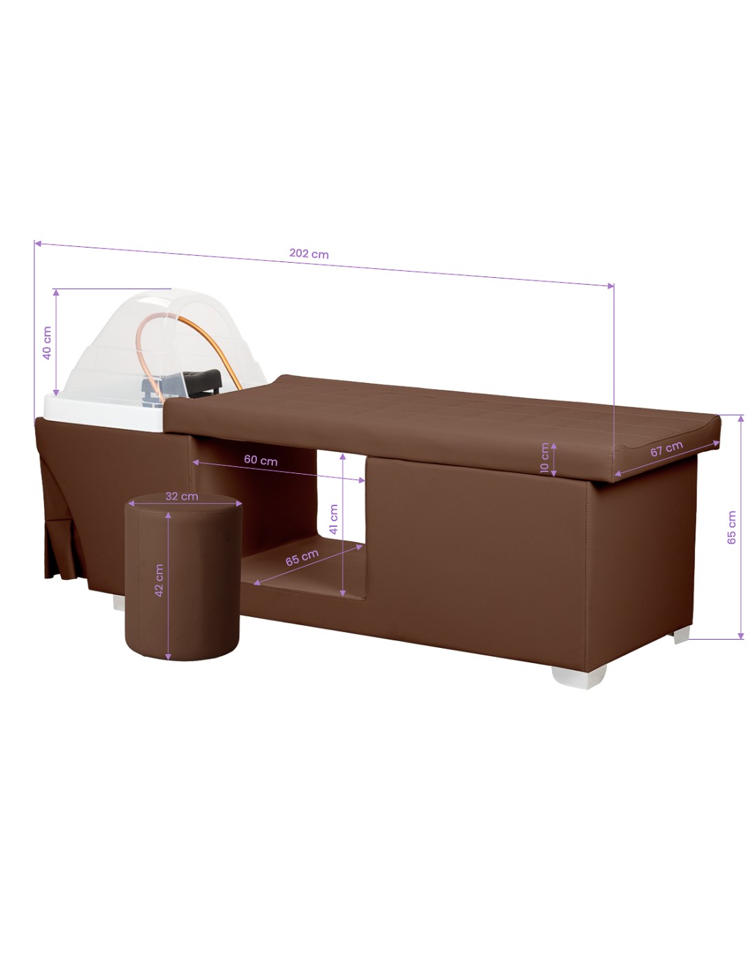 Il lavabo è dotato di un miscelatore che consente di regolare con precisione la temperatura dell'acqua in base alle esigenze del cliente. Uno spazio dedicato al soffione doccia migliora l'efficienza, mentre un tappo cromato con uno speciale filtro assicura il controllo del flusso dell'acqua e mantiene un elevato livello di igiene. L'attacco dell'acqua si trova all'interno della base, dietro il tessuto, nascondendo esteticamente le tubature e conferendo all'intera unità un aspetto elegante. Il lettino ergonomico assicura il comfort durante i vari trattamenti di bellezza. Un pratico pouf completa l'unità, aumentando il comfort del personale e migliorando la funzionalità dell'unità. Queste caratteristiche rendono l'unità di lavaggio ideale sia per i saloni di parrucchieri che per le SPA.