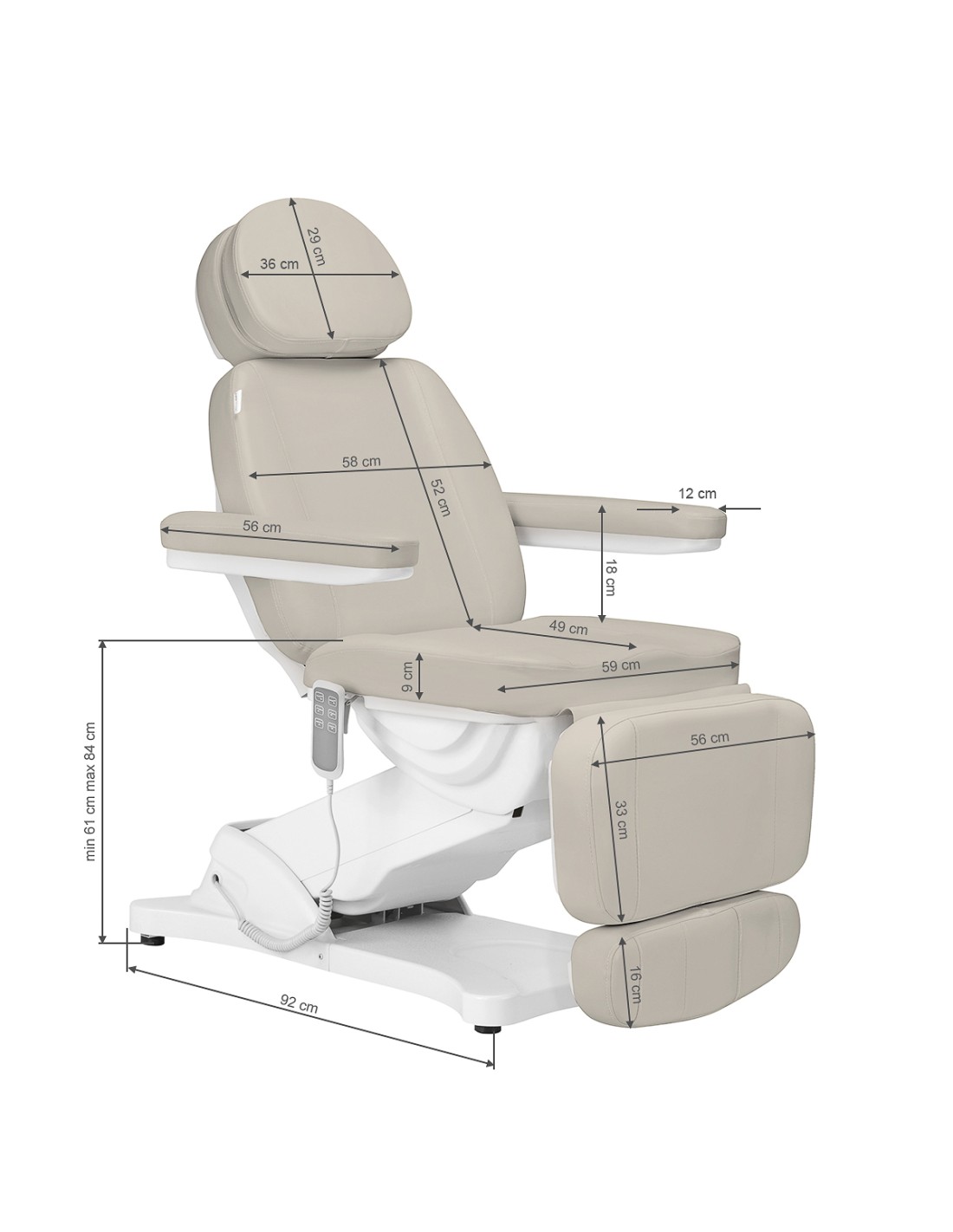 Grazie al telecomando di facile utilizzo, la poltrona si regola agevolmente su 3 piani: altezza, schienale e poggiapiedi. Il sedile può essere regolato a un'altezza compresa tra 61 e 84 cm e la sedia raggiunge una lunghezza di 2 m quando è completamente estesa. Queste dimensioni consentono all'apparecchiatura di essere facilmente utilizzata da persone di diverse altezze e di essere adattata al trattamento in corso e alle esigenze individuali, a tutto vantaggio del comfort dell'utente e dell'operatore. Le maniglie situate su entrambi i lati del sedile consentono di appendere il telecomando in modo da averlo sempre a portata di mano.