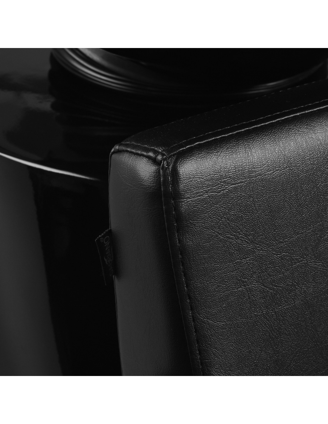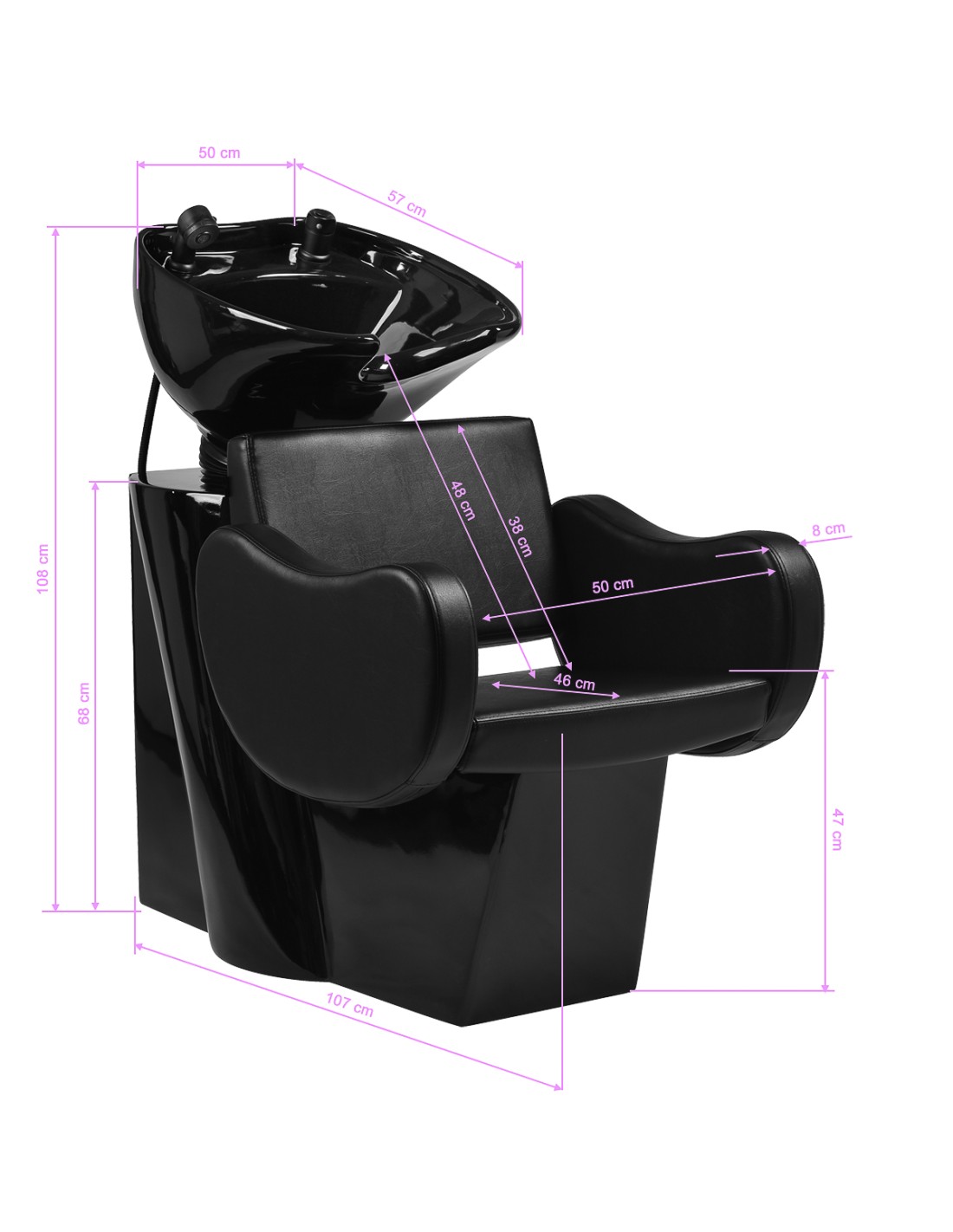 La profonda vasca in ceramica nei toni del nero riduce gli schizzi d'acqua e dei prodotti utilizzati durante i trattamenti. L 'inclinazione regolabile della vasca consente di adattarla alle esigenze individuali e il materiale utilizzato rende il lavabo durevole, resistente alle macchie e ai graffi e facile da mantenere pulito. Il collare dal profilo ergonomico offre un comodo appoggio per la testa, mentre il morbido rivestimento in plastica nera elimina la sensazione di freddezza della superficie in ceramica.