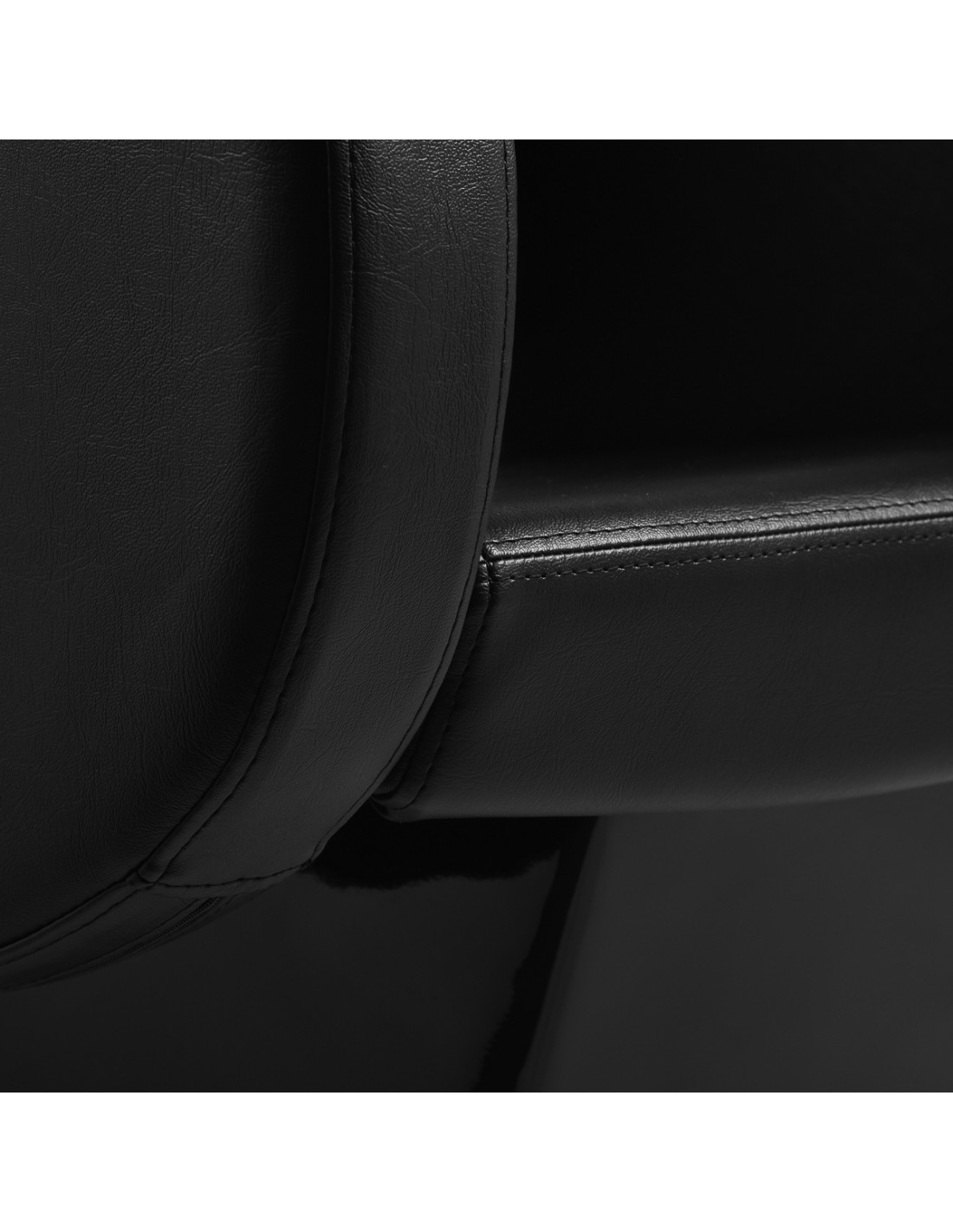 La poltrona, imbottita di schiuma resistente, garantisce un elevato comfort, mentre i braccioli, con i loro profili, consentono una posizione comoda per le spalle. Lo schienale, con un'angolazione ottimale, sostiene la colonna vertebrale, assicurando un completo relax. Il rivestimento in pelle sintetica nei toni del nero garantisce durata e facilità di pulizia. La forma moderna del mobile sottolinea il carattere elegante dell'interno. Il set comprende una serie completa di accessori con finitura opaca nei toni del nero, tra cui rubinetto, soffione e tubi flessibili coordinati, che forniscono un set completo di strumenti di lavoro.
