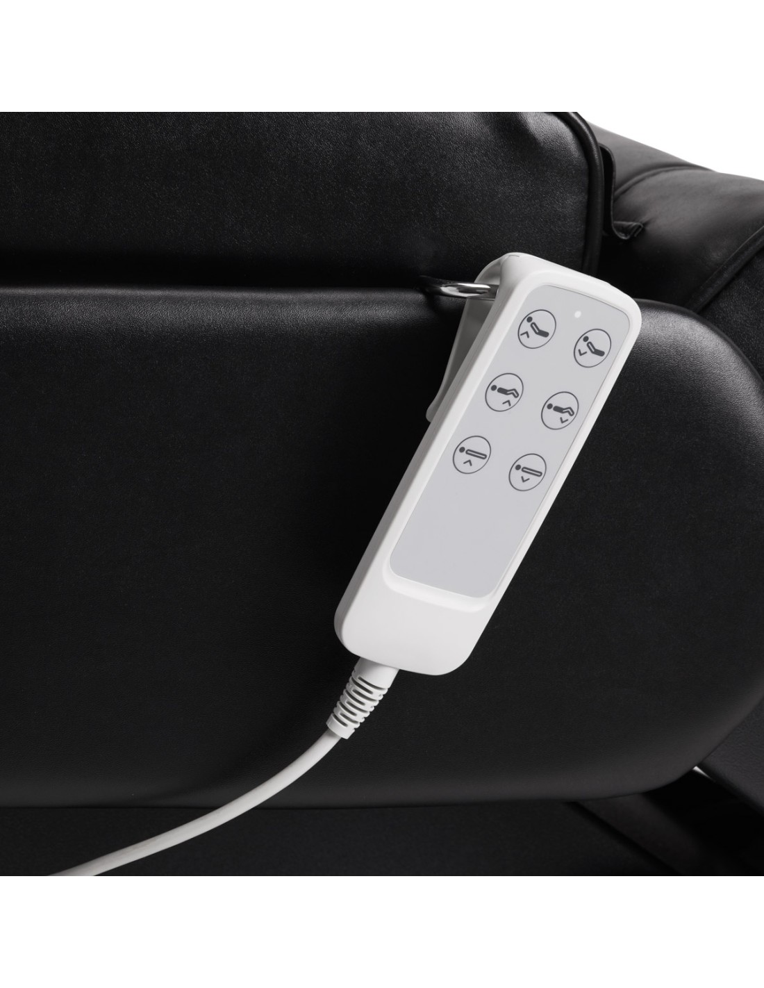 La poltrona è inoltre dotata di braccioli mobili, di un poggiatesta retrattile e di una maniglia in metallo per appendere il telecomando. È imbottita di schiuma della giusta consistenza e rivestita di pelle sintetica piacevole al tatto nei toni del nero, che rende l'apparecchiatura comoda da usare, resistente all'umidità e facile da pulire. Gli elementi decorativi in legno sui braccioli distinguono la poltrona dagli altri modelli, fornendo un accento visivamente attraente ed elegante. Gli orli opportunamente sagomati conferiscono alla poltrona un aspetto elegante e rendono la seduta ergonomica.