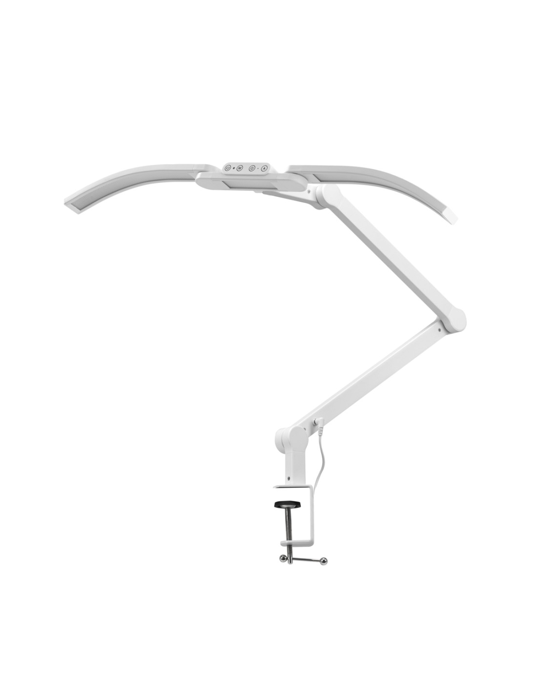 La forma slanciata e geometrica della lampada attira l'attenzione con il suo aspetto moderno e allo stesso tempo intramontabile. Il colore bianco, combinato con la finitura opaca, conferisce alla struttura un carattere elegante e professionale, che si integra perfettamente negli interni minimalisti dei saloni di bellezza. Il montaggio al piano di lavoro è possibile grazie a un supporto a morsa, con un'apertura massima di 6,3 cm, adatto alla maggior parte dei piani di lavoro. Il tutto crea un elemento d'arredo coerente ed estetico, che unisce un'elevata funzionalità a un design raffinato.