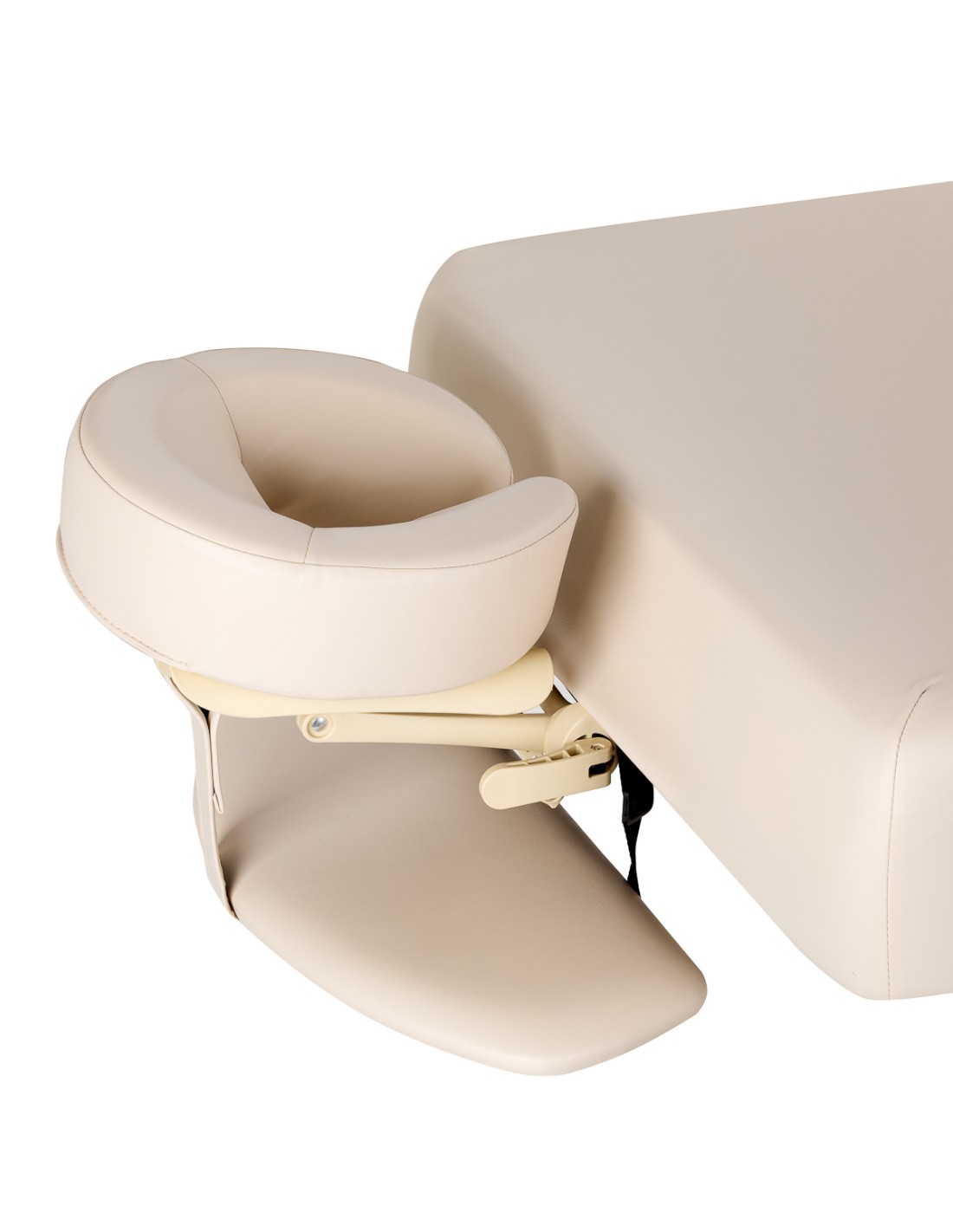 Il poggiatesta ergonomico con apertura per il viso, incluso nel set, assicura una comoda posizione della testa durante i trattamenti eseguiti sulla schiena, sull'addome e in posizione supina. Un adeguato sostegno aumenta il comfort del cliente anche durante le procedure più lunghe e favorisce il completo rilassamento. L'elemento è regolabile in inclinazione su due piani, il che consente di adattare con precisione l'impostazione al tipo di trattamento e alle esigenze individuali.
